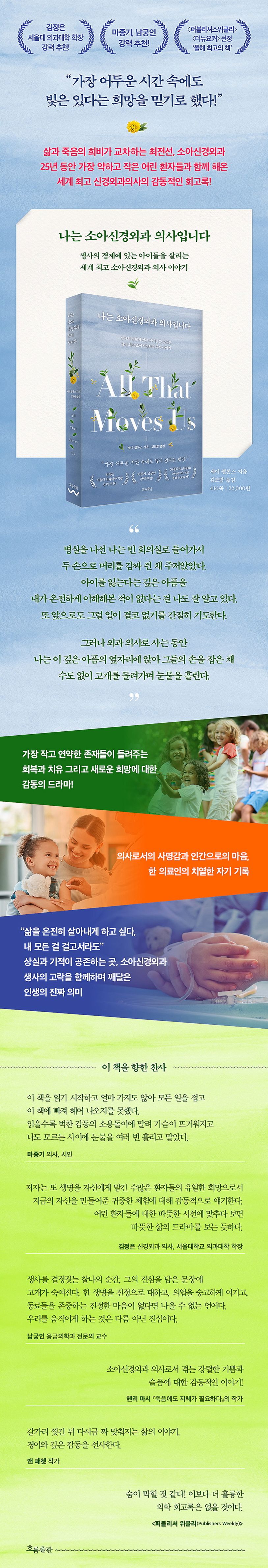 긴박하고 치열하며 참혹하기까지 한 수술실 모습, 그동안 자신이 만났던 어린 환자들과 그들의 보호자들로부터 얻은 깨달음, 의사인 동시에 그 자신이 종양 환자였으며 루게릭병으로 아버지를 잃은 아들이기도 했던 경험 등이 다채롭게 어우러진 이 한 권의 책은 어둡고 힘든 지금의 시대를 비추는 따스한 희망의 빛이라 해도 손색없을 만큼 깊은 감동을 우리에게 선사한다.