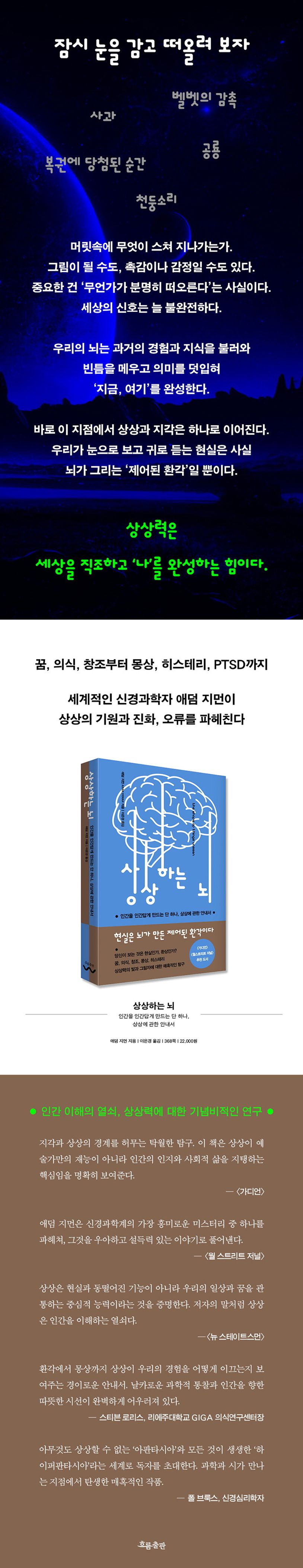 『상상하는 뇌』는 영국 엑서터대 의과대학 교수이자 신경과학자 애덤 지먼이 30여 년간 의식·기억·심상의 신경 기제를 연구하며 축적한 성과를 토대로, 인간 상상의 빛과 그림자를 신경과학적으로 탐구한 책이다. 상상력으로 촉발되는 꿈, 의식과 심상의 관계, 창조의 과정부터 환각, 망상, 트라우마에 이르기까지 저자는 상상이 인간 사고와 지각을 어떻게 구성하고 왜곡하는지를 정밀하게 추적한다. 이를 통해 상상이 단순한 공상이 아니라 뇌가 세상을 직조하고 ‘나’를 형성하는 핵심 요소임을 입증하고, 뇌과학·철학·예술을 넘나드는 사례와 실험으로 그 기원과 진화를 입체적으로 탐구한다. 이런 시선은 현실과 환상의 경계가 흔들리는 AI, 딥페이크 시대에 우리가 ‘무엇을 보고 듣는가’를 다시 성찰하게 하고 인간을 인간답게 만드는 마지막 영역인 상상력의 중요성을 되짚어보게 한다.