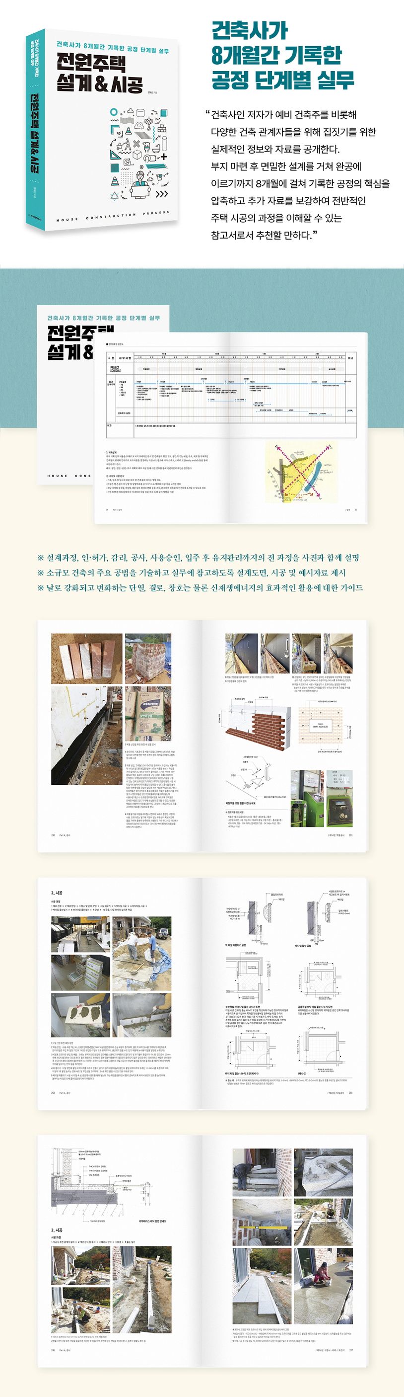 저자는 건축사로서 오랫동안 건축업무에 종사하면서 설계의 중요성과 진행 과정, 인·허가 절차, 합리적인 공사비의 산정 기준, 효율적인 공사와 유지, 관리 등을 고민해 왔다. 이를 계기로 경기도 이천 소재의 주택 프로젝트를 진행하면서 설계, 인·허가, 감리, 공사, 사용승인, 입주까지의 전 과정을 8개월에 걸쳐 사진과 함께 기록하였고, 그 내용들을 정리하고 보강하여 이번에 책으로 엮어냈다. 건축기술이 워낙 방대하고 깊이가 천차만별인 만큼 중심 내용은 주택과 같은 소규모 건축에 초점을 맞춘 가운데, 다양한 건축공법과 현장의 실제적인 내용, 현대건축과 고건축의 비교 사항 등도 첨부하여 기술하였다. 특히 예비 건축주는 물론 건축 관계자가 공정별 현장 실무에서 도움이 되도록 설계도면, 시공법 및 예시자료까지 충실하게 담았다.