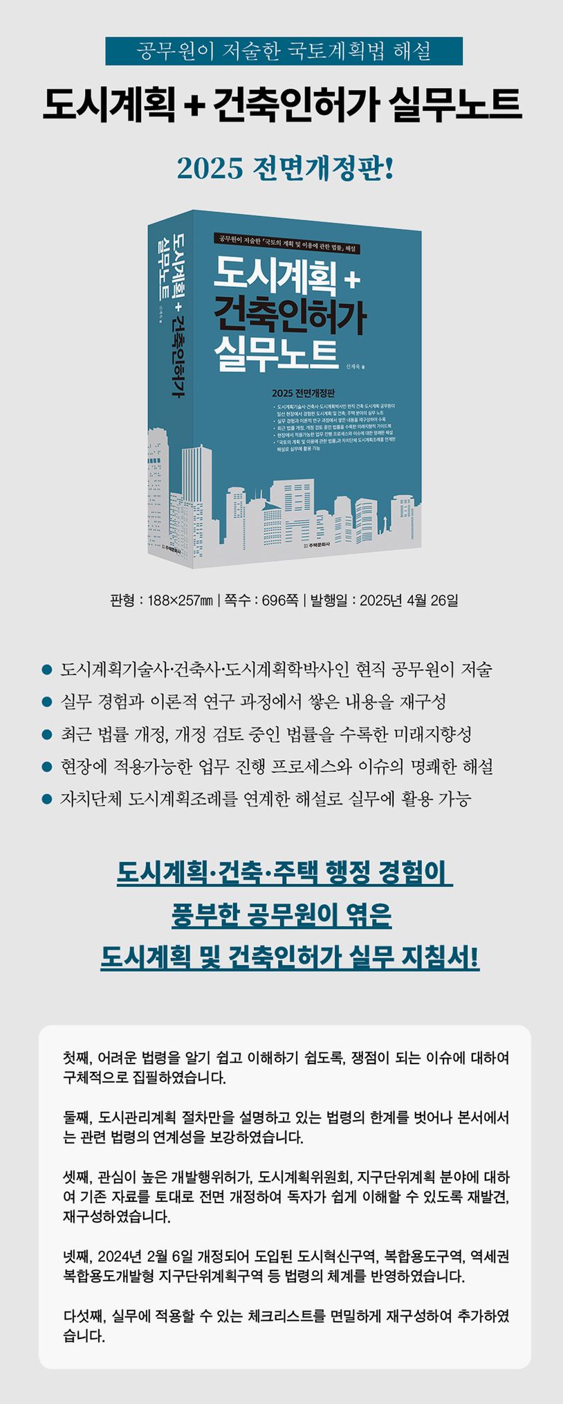 chapter1|총칙제1절국토계획법관련용어정의및이해제2절상·하위계획,다른법률간의도시·군관리계획제3절건축법관련용어정의및이해제4절건축법에의한건축물의용도제5절주택법에의한주택의정의및종류chapter2|도시·군기본계획제1절도시기본계획개요제2절도시·군기본계획수립절차chapter3|도시·군관리계획제1절도시·군관리계획개요제2절도시·군관리계획수립절차제3절도시·군기본계획변경없이결정할수있는도시·군관리계획제4절도시관리계획입안및결정단계별체크리스트chapter4|공간재구조화계획제1절공간재구조화계획입안제2절공간재구조화계획내용및결정제3절공간재구조화계획등에관한지침주요내용chapter5|용도지역·용도지구·용도구역제1절용도지역의종류제2절용도지구의종류제3절용도구역의종류제4절도시혁신구역제5절복합용도구역제6절도시·군계획시설입체복합구역제7절도시혁신구역등3개구역의공공기여및특례제8절공유수면의용도지역제9절다른법률에따라지정된용도지역지정의제제10절신도시계획의용지와용도지역의차이chapter6|도시·군계획시설제1절도시·군계획시설의개요제2절도시·군계획시설의설치및관리제3절도시·군계획시설부지의매수청구제4절도시·군계획시설결정실효및해제제5절도시·군계획시설결정·구조등에관한규칙제6절공동구설치및관리chapter7|지구단위계획구역및지구단위계획제1절지구단위계획의수립제2절지구단위계획구역개요제3절지구단위계획구역지정절차제4절지구단위계획개요제5절지구단위계획입안및결정절차제6절공공기여에따른지구단위계획완화제7절기반시설기부채납제8절지구단위계획과주택건설사업계획제9절지구단위계획과도시·군계획시설의관계제10절지구단위계획과개발행위허가의관계제11절지구단위계획결정도서작성지침chapter8|개발행위의허가제1절개발행위허가대상및인허가절차제2절개발행위허가절차및도시계획위원회심의제3절개발행위허가기준제4절도시·군계획시설부지에서의개발행위제5절개발행위에따른공공시설귀속제6절비도시지역에서숙박시설,음식점등허가기준제7절개발행위허가의제한제8절개발밀도관리구역제9절성장관리계획구역chapter9|용도지역·용도지구·용도구역에서의행위제한제1절건축제한및완화제2절기존건축물에대한특례제3절건폐율제4절용적률제5절2개이상의용도지역에걸치는대지적용기준제6절건축물대지가지역·지구에걸치는경우의조치제7절건축물의용도제한chapter10|도시·군계획시설사업의시행제1절도시·군계획시설사업시행의의의제2절단계별집행계획의수립제3절도시·군계획시설사업시행자제4절도시·군계획시설사업의실시계획작성및인가제5절도시·군계획시설사업의이행담보제6절서류의열람및실시계획고시제7절토지수용및공사준공등의절차제8절도시·군계획시설사업의공공시설귀속chapter11|비용제1절비용부담제2절국비보조및융자chapter12|도시계획위원회의구성및운영제1절중앙도시계획위원회제2절지방도시계획위원회chapter13|토지거래의허가제1절토지거래허가구역의지정제2절토지거래계약의허가제3절선매및매수청구,이행강제금등chapter14|보칙1.시범도시지정2.인·허가취소,공사중지등의조치3.권한의위임및위탁