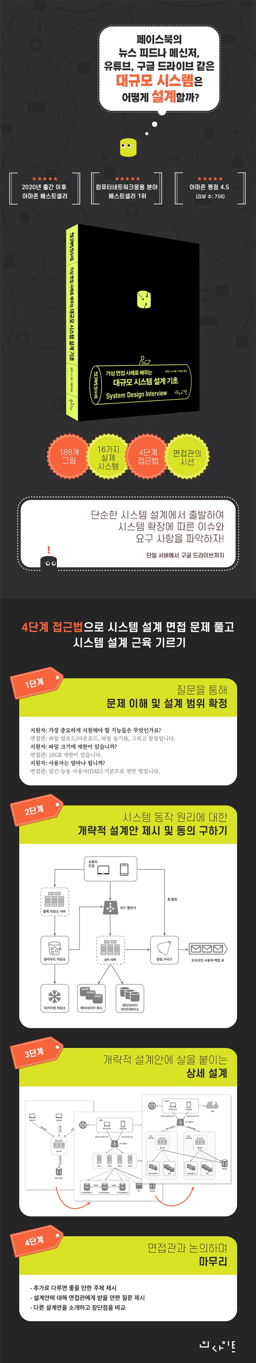 이 책은 면접 상황을 가정하고 단순한 시스템 설계에서 출발하여 시스템 확장에 따른 이슈와 요구 사항을 파악하면서 대규모 시스템을 구축해 나가는 방법을 설명한다. 또한 각 시스템 특성에 맞게 여러 설계안을 소개하고 장단점을 비교하여 가장 적합한 설계안을 제시한다. 단일 서버부터 복잡한 시스템까지,여러 가지 사례로 면접관과 가상으로 대화를 주고받으며 이미지 트레이닝하다 보면 어떤 시스템이라도 설계할 수 있는 근육이 길러질 것이다.
