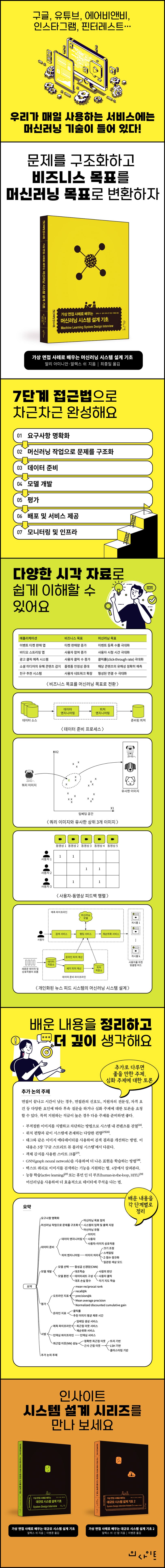 이 책은 실제 서비스되고 있는 머신러닝 사례, 7가지 설계 접근법, 실제 시스템 설계에 참여한 엔지니어들과 저자의 노하우라는 세 가지 축으로 입체감 있게 설계 지식을 전달한다. 블로그, 논문 등 곳곳에 흩어져 있는 뛰어난 아이디어를 저자와 여러 엔지니어, 매니저가 개인적인 인사이트를 녹여 재구성했기에 머신러닝을 공부하는 독자에게 훌륭한 나침반이 되어 줄 것이다. 또한 복잡하고 어려운 이론은 걷어 내고 모두에게 익숙한 실제 시스템을 사례로 소개하고 있어, 머신러닝 엔지니어가 아니더라도 시스템의 원리가 궁금한 독자라면 누구나 흥미롭게 읽을 수 있다.