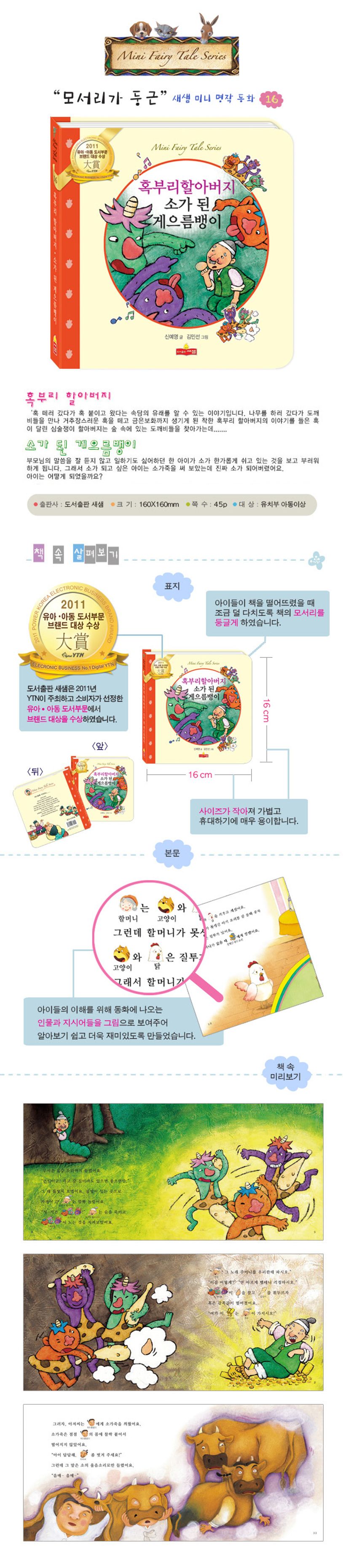 「새샘 미니동화」시리즈 제16권『혹부리할아버지 소가 된 게으름뱅이』. 이 시리즈는 세계 명작 동화와 전래동화들 중에서 아이들의 정서를 우선으로 생각하는 부모들이 뽑은 서른 일곱 편의 이야기를 30권으로 엮은 동화이다. 나무를 하러 갔다가 도깨비들을 만나 거추장스러운 혹을 떼고 금은보화까지 생기게 된 착한 혹부리 할아버지의 이야기를 들은 심술쟁이 할아버지가 숲 속에 있는 도깨비들을 찾아가는 이야기다.