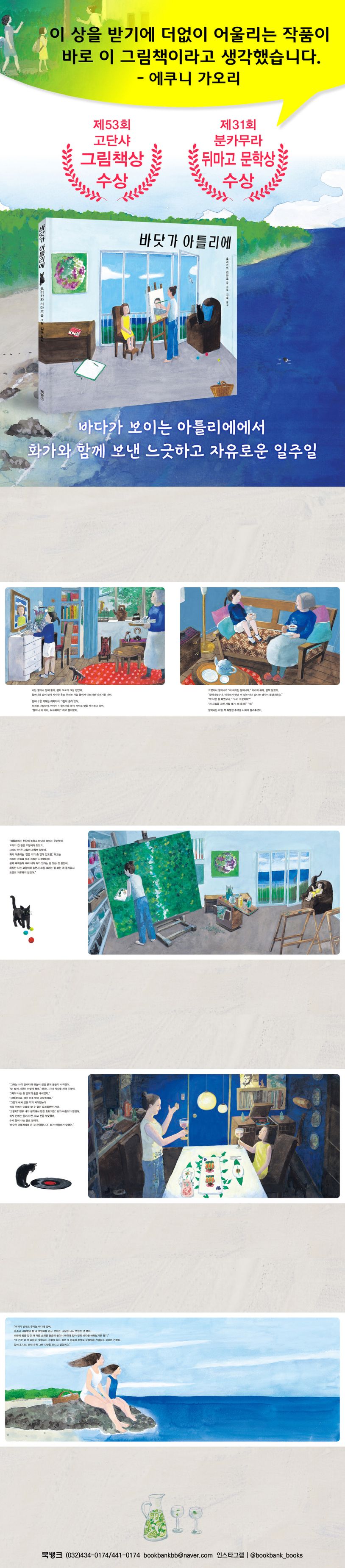 마음이 아파 학교를 쉬고 있던 소녀가 다시 느긋하게 마음을 열 수 있었던 보물 같은 나날이 아름다운 그림과 어우러져 마치 단편 영화 한 편을 감상하는 듯하다. 책을 한 장 한 장 넘길 때마다 시원하게 펼쳐지는 그림은 바다가 보이는 아틀리에에서 화가와 함께 보냈던 소녀의 여름이 어땠는지를 섬세하게 알려 준다. 이 그림책은 이제는 할머니가 된 소녀의 그때 그 시간을 회고하는 형식으로 전개된다.