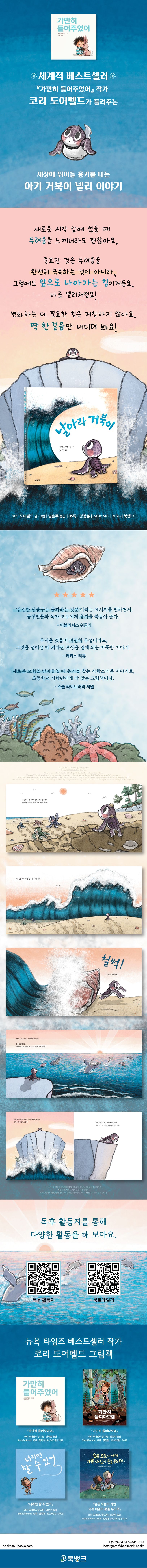 세계적베스트셀러『가만히들어주었어』작가코리도어펠드가들려주는세상에뛰어들용기를내는아기거북이넬리이야기·파스텔톤의부드러운색감을지닌친근한만화풍그림속에서,도어펠드는‘유일한탈출구는돌파하는것뿐’이라는메시지에깊은공감을불어넣는다.거센감정의물결앞에서도등장인물과독자모두에게용기를북돋아주는그녀의뛰어난재능을다시한번증명한다.-퍼블리셔스위클리·무서운것들이여전히무섭더라도,그것을넘어설때커다란보상을얻게되는따뜻한이야기.-커커스리뷰·새로운모험을받아들일때용기를찾는사랑스러운이야기로,초등학교저학년에게딱맞는그림책이다.-스쿨라이브러리저널*인증유형:공급자적합성확인