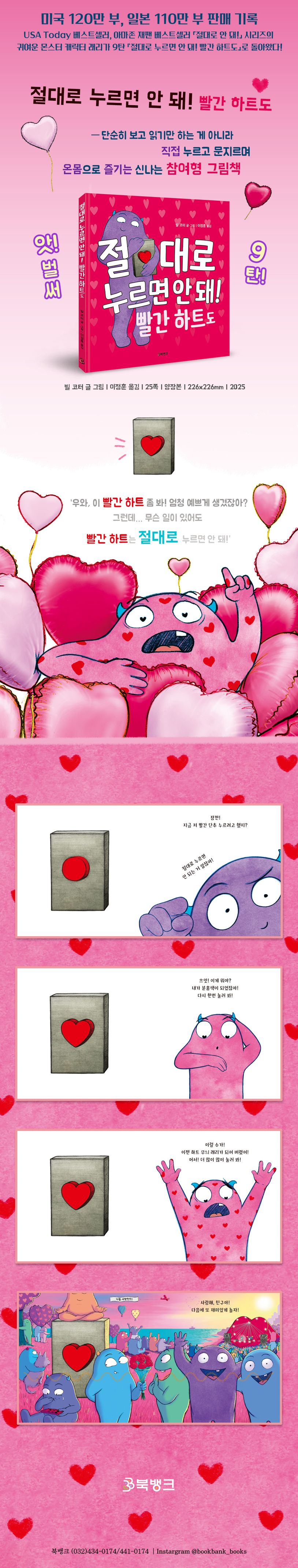 책속에서p.2~5안녕,얘들아!반가워.너의오랜친구래리야.잠깐!지금저빨간단추누르려고했지?절대로누르면안되는거알잖아!p.8~9누르니까하트모양으로변했네!더예뻐졌잖아?그럼한번더눌러볼까?p.14~15하트풍선으로가득찼어!손가락으로콕콕풍선으로터뜨려줘!p.20~21아,이제됐다.여기에이렇게써있어.나자신을한번꼭껴안아주세요.[또단추를눌러버린사람을위한설명서]*인증유형:공급자적합성확인