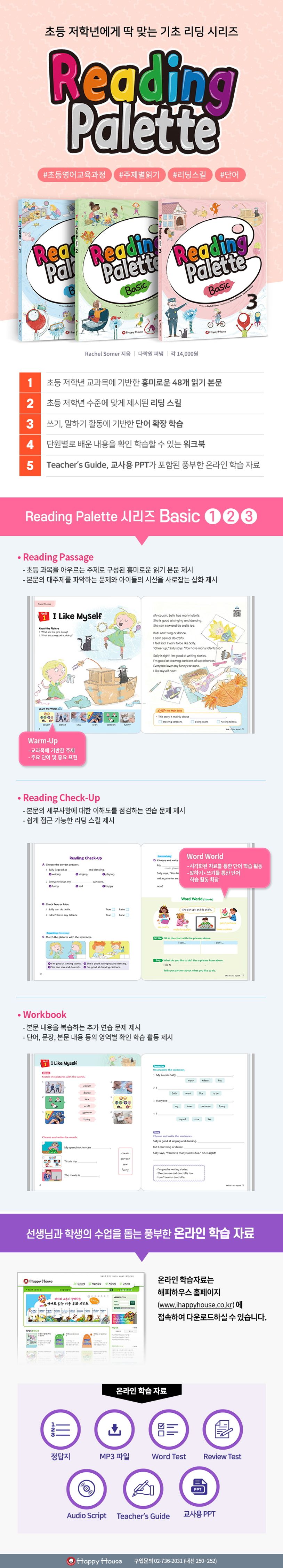 초등 저학년의 눈높이에 맞는 이야기와 쉽게 접근하는 리딩 스킬, 주제별 단어 학습을 통해 읽기의 기초를 다져 주는 리딩 시리즈! 총 3권으로 구성된 Reading Palette-Basic 시리즈는 각 권을 16개 단원으로 구성하였으며, 초등 교과 과정을 바탕으로 하는 재미있고 유익한 이야기들을 담고 있습니다. 아이들에게 자칫 어렵게 느껴질 수 있는 리딩 스킬 문제를 쉬운 형태로 제시하여 부담없이 접할 수 있게 하였습니다. 또한, 단원마다 주제별 추가 단어 학습을 통해 머릿속에 차곡차곡 쌓이는 단어들은 리딩에 자신감을 키워줍니다.