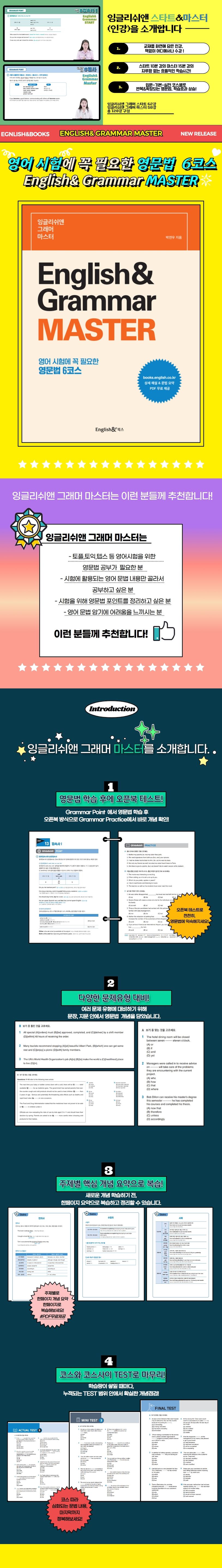 잉글리쉬앤 그래머 START & 잉글리쉬앤 그래머 MASTER 는 잉글리쉬앤 그래머는 ‘독해를 위한 영문법 암기’라는 목표로 필수적인 영어 개념을 효율적으로 습득하고 힘들이지 않고 암기할 수 있는 가이드라인을 제시하는 기초 영문법서입니다.