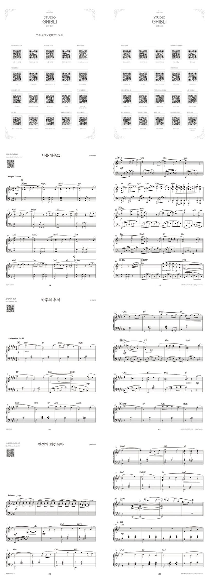 《이웃집 토토로》, 《센과 치히로의 행방불명》, 《하울의 움직이는 성》 등 국내에도 잘 알려진 ‘스튜디오 지브리’ 사의 애니메이션 명곡 OST 중 베스트 40곡을 선정하여 원곡 그대로 편곡한 피아노 곡집입니다. 지브리 애니메이션이 만들어진 연도별로 차례대로 구성되어있으며 각 곡의 연주 동영상을 QR코드를 통해 편리하게 감상 할 수 있습니다. 1984년 제작된 《바람계곡의 나우시카》부터 2014년 《추억의 마니》까지 원곡 그대로 편곡한 ‘오리지널 버전’으로 지브리 애니메이션의 감동을 그대로 느껴보세요!