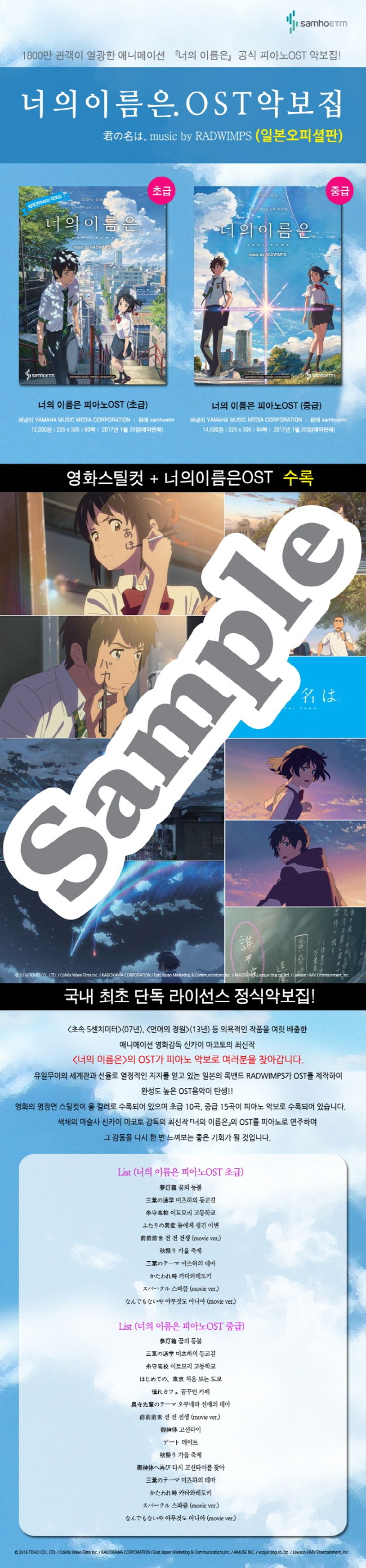 1800만 관객이 열광한 애니메이션 『너의 이름은』공식 피아노OST 악보집!