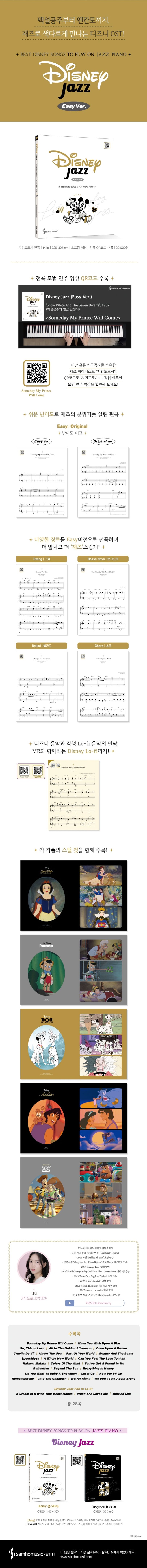 『Disney Jazz (Easy Ver.)』은 디즈니 작품의 베스트 OST 곡들을 모아 재즈로 편곡하여 수록한 연주곡집이다. 디즈니 하면 대표적으로 떠오르는 인어공주 OST ‘Under The Sea’, 겨울왕국 OST ‘Let It Go’부터 2021년 작인 엔칸토 OST ‘We Don't Talk About Bruno’까지 총 28곡이 수록되었다. 재즈 피아니스트 ‘지민도로시’만의 편곡으로 다양한 장르의 재즈를 쉽게 연주할 수 있도록 구성하였으며, 디즈니 음악에 감성 Lo-fi 음악을 더한 ‘Disney Jazz Fall in Lo-fi’는 MR이 포함되어 더욱더 감성 있고 그루브한 연주를 즐길 수 있다. 작품마다 스틸 컷이 포함되어 있으며, 저자의 전곡 모범 연주 영상을 QR코드로 확인할 수 있다.