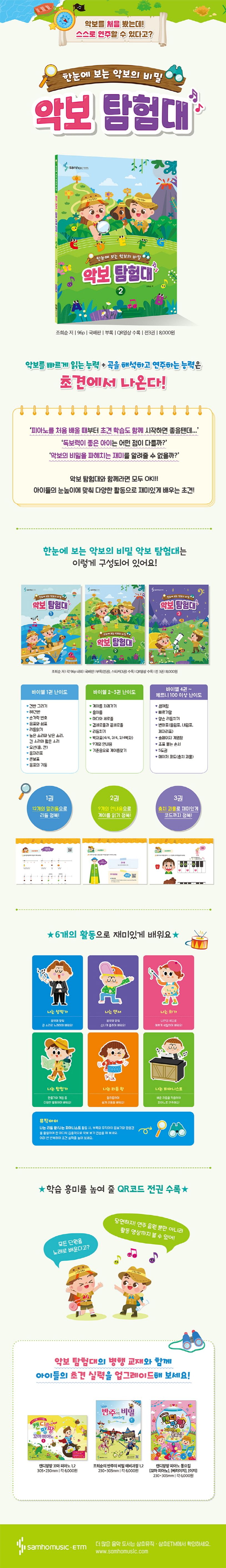 〈한눈에 보는 비밀, 악보 탐험대 2〉은 바이엘 2~3권의 난이도로, 피아노를 처음 배우는 아이들을 위한 초견 학습을 위한 도서입니다. 리듬, 특강, 교육 현장에서 직접 경험한 저자의 노하우가 담긴 6개의 활동으로 쉽고 재미있게 초견 학습을 할 수 있습니다. 모든 단원을 노래로 배우고, 전곡 모범 연주 영상을 QR코드로 편리하게 감상하며, 다양한 활동으로 구성된 커리큘럼으로 쉽게 악보를 읽고, 스스로 피아노로 연주할 수 있습니다. 악보를 한눈에 알아볼 수 있는 악보 탐험대와 함께 하세요!