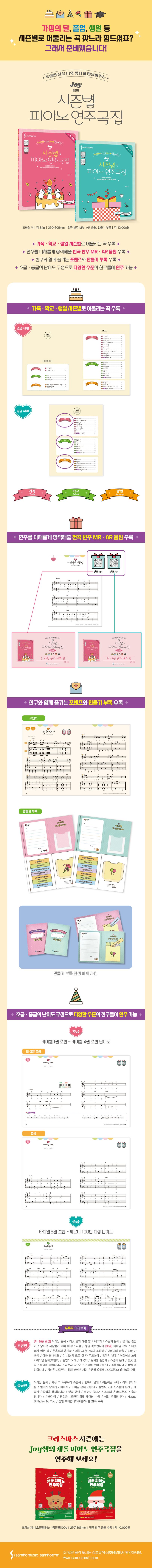 조희순 교수의 시즌별 피아노 연주곡집은 '가족', '학교', '생일' 주제로 이루어진 연주곡집이다. 이 책은 해당 시즌에 어울리는 곡들을 선별하여 수록하여서, 시즌이 바뀔 때마다 악보를 찾아다니지 않고도 필요한 곡을 쉽게 찾을 수 있다. 또한, 연주자의 난이도에 따라 선택할 수 있는 반주 QR코드로 AR(멜로디가 있는 반주)과 MR(멜로디가 없는 반주)이 있어, 더욱 다채롭게 연주가 가능하다. 효도 쿠폰북, 우정 쿠폰북 카드를 직접 만들 수 있는 특별 부록도 포함되어 있으니 연주한 곡과 더불어 쿠폰북을 활용하여 시즌을 만끽해 보자!