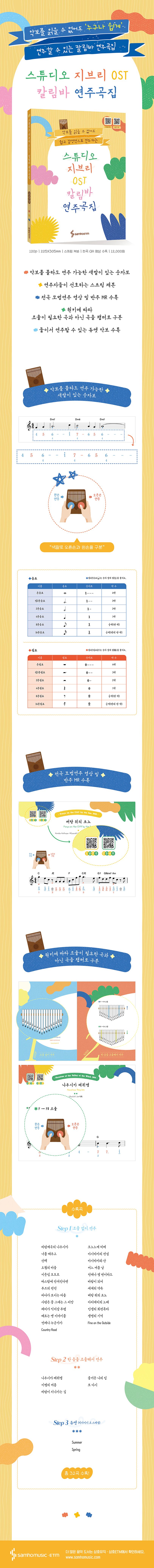 〈스튜디오 지브리 OST 칼림바 연주곡집〉은 연주자들이 선호하는 스프링 제본으로, 국내에 잘 알려진 스튜디오 지브리 애니메이션 명곡 OST 30곡과 스페셜 히사이시 조 듀엣 2곡을 담았다. 곡은 개봉 연도별 차례로 수록하였으며, 연주하고자 하는 곡을 찾아 조율이 필요한 곡과 아닌 곡으로 챕터를 구성하였다. 전곡에 삽입된 QR코드를 통해 모범 연주 영상을 보거나 반주 MR과 함께 연주할 수 있다. 악보를 읽을 수 없어도 누구나 쉽게 연주하며 원곡의 감동을 다시 한번 느껴보자!