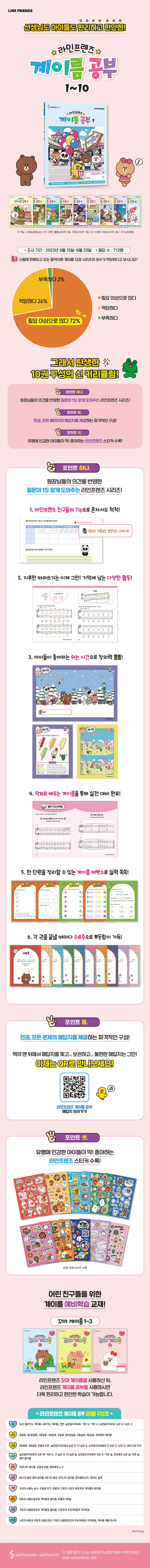 〈라인프렌즈 계이름 공부〉는 이제 막 음악을 배우는 아이들이 쉽게 악보를 읽고 연주할 수 있도록 돕는 계이름 교재이다. 흔히 계이름 교재는 12권으로 구성되어 있는데, 뒷권까지 학습하기 쉽지 않고 반복되는 부분이 많아 아이들이 어려워하는 경우가 있다. 그 고민을 해소하기 위해 꼭 필요한 커리큘럼만 갖춰 10권으로 구성했으며, 반복적인 따라쓰기가 아닌 다양한 활동으로 자연스레 계이름에 다가갈 수 있게끔 했다. 권마다 챕터를 정리할 수 있는 ‘계이름 제빵소’, 실전 계이름을 학습할 수 있는 ‘악보로 배우는 계이름’을 실어 더욱 성취도를 높일 수 있다. 쉽게 공부할 수 있는 포인트만 쏙쏙담은 라인프렌즈 계이름 공부와 함께 행복한 음악 공부를 시작하길 바란다.