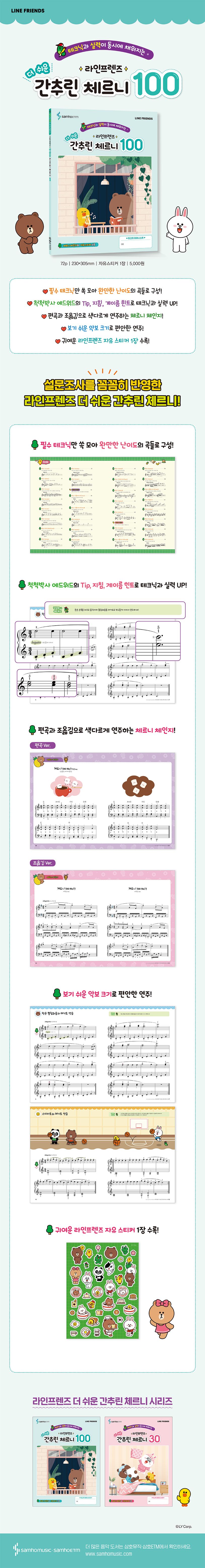 「라인프렌즈 더 쉬운 간추린 체르니 100」은 귀여운 라인프렌즈와 함께 즐겁게 연주하는 체르니 교본이다. 체르니 100 과정에서 꼭 필요한 필수 테크닉들로 선곡했다. 척척박사 에드워드가 알려주는 연주 Tip은 아이들이 혼자서도 재미있게 연주할 수 있도록 도움을 준다. 또, 어려운 덧줄 · 덧칸 음에 계이름 힌트를 주어 막힘없이 연주할 수 있고, 보기 좋은 악보로 편안하게 연주할 수 있다. 기존의 체르니 곡을 편곡한 편곡 Ver.과 조옮김 Ver.으로 실력을 업그레이드 할 수 있는 체르니 체인지가 수록되었다. 귀여운 라인프렌즈 스티커가 1장 수록되었다.
