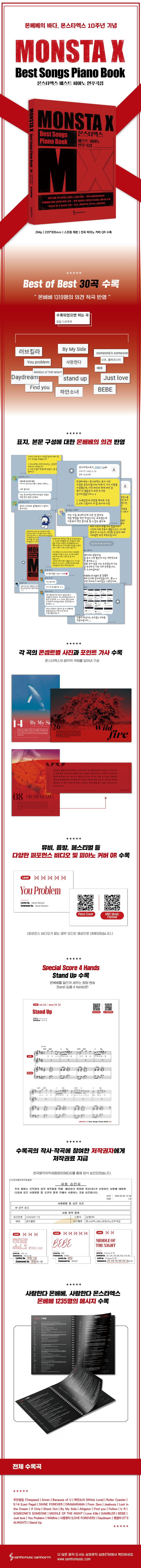 From MONSTA X’s debut track Trespass, to the touching fan songs like 5:14 (Last Page) and LOVE FOREVER, the heartfelt SOMEONE’S SOMEONE from their U.S. album, and title tracks that solidified their unique color such as DRAMARAMA, Follow, Love Killa, and GAMBLER-this book includes 30 unforgettable songs that no MONBEBE could ever “just like a little.”