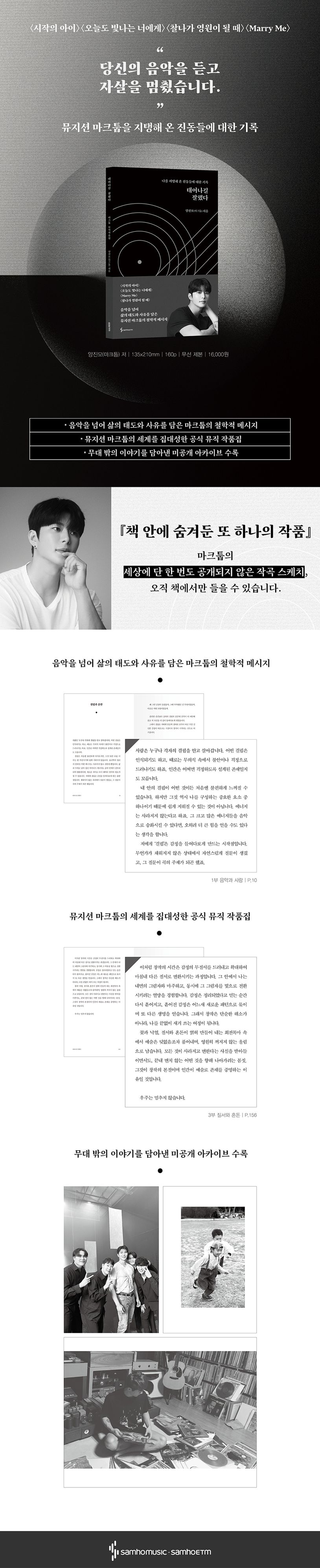 단순한 음악이 아닌 삶을 붙드는 손길. 뮤지션 마크툽의 첫 뮤직작품집이 출간되었다. 이번 책은 음악 기록을 넘어 노래와 글, 그리고 삶의 태도를 아우르는 뮤지션 마크툽의 세계를 집대성한 단행본이다. 책 속에는 그의 철학적 메시지와 음악적 사유가 담겨 있으며, 무대 안팎의 순간들을 기록한 아카이브가 수록되어 있어 독자들에게 새로운 감동을 전한다. 팬들에게는 소장가치 높은 뮤지션의 첫 작품집이자, 음악을 사랑하는 모든 이들에게는 읽고 듣는 새로운 뮤직 앨범이 될 것이다. 글과 기록을 통해 마크툽의 또 다른 목소리를 경험할 수 있다는 점도 특별하다. 특히 지금까지 어디에도 공개되지 않았던 미발표한 작곡 스케치가 QR코드로 수록되어 있어 오직 책을 통해서만 경험할 수 있는 특별한 선물이 된다.