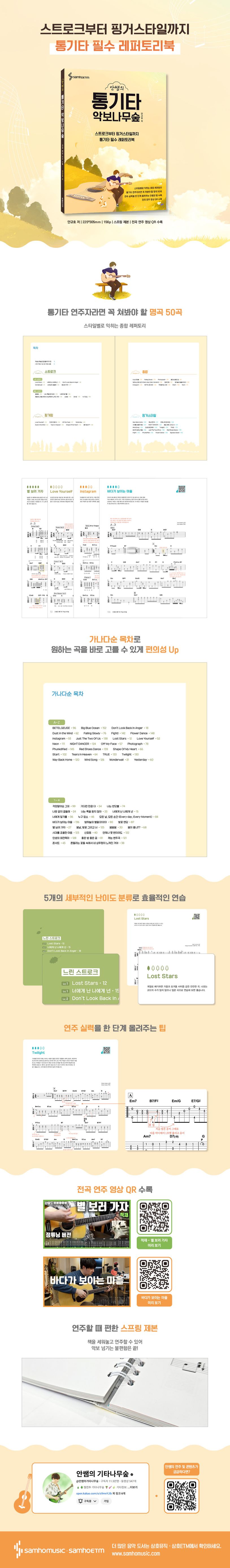 통기타 연주자들의 필수 레퍼토리를 한 권에 담은 타브 악보집 〈안쌤의 통기타 악보나무숲〉! 수많은 기타 연주자들에게 사랑받은 명곡 50곡을 엄선해 수록했으며 별 보러 가자, 폰서트, Love Yourself, Photograph, Twilight 등 다양한 장르의 인기곡이 포함되어 있다.