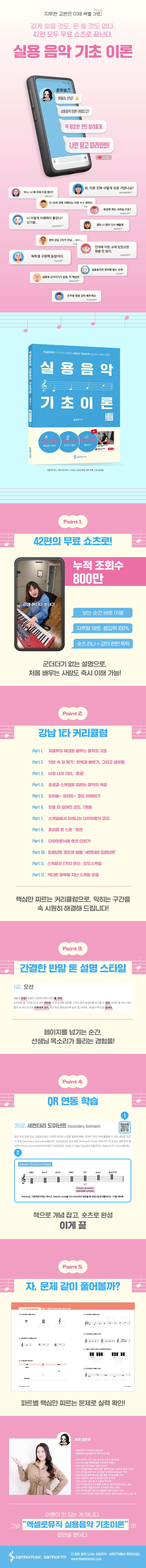 이 책의 가장 큰 강점은 ‘빠른 학습’에 있다. 3분도 안 되는 숏폼 강의의 방식 그대로, 딱딱하고 어렵게 느껴지던 음악 이론을 짧은 호흡ㆍ직관적인 예시ㆍ핵심만 남긴 커리큘럼으로 정리해 누구나 막힘없이 이해할 수 있도록 구성했다.