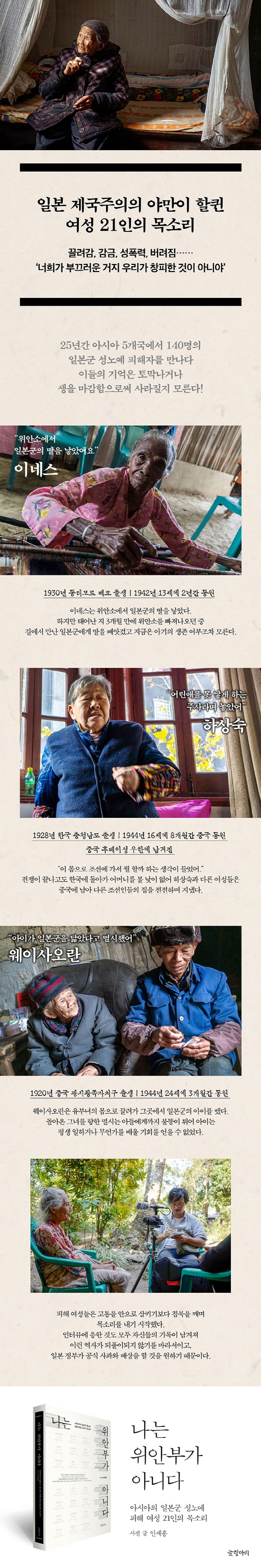 사진을 찍고 글을 쓰는 안세홍은 25년여간 일본군 아시아 성노예 피해 여성들을 만나왔다. 한국, 중국, 필리핀, 인도네시아, 동티모르의 여성 140명을 만났고(2018년 평양에 가면서 피해자 8명의 인터뷰를 시도했으나 만나지 못했고, 타이완 역시 피해자 수소문을 했으나 성사되지 않았다), 그중 21명의 이야기를 이 책에 담았다. 한국 4명, 중국 4명, 인도네시아 5명, 필리핀 4명, 동티모르 4명이며, 이 가운데 8명이 인터뷰 후에 돌아가셨다. 끌려감, 감금, 성폭력, 버려짐. 이 모든 것은 70~80년의 세월이 지난 지금도 지울 수 없는 상처로 남아 있다. 나라와 나이, 동원 방법과 기간 등의 피해 사례로만 그녀들의 아픔을 구분하는 것은 무의미하며, 이 문제는 아시아태평양전쟁이 야기한 인권 문제로 바라봐야 하기에 저자는 아시아 지역 전체를 대상으로 피해 여성들을 만나왔던 것이다. 이 책은 범아시아적 취재와 조사를 담고 있는 유일한 책이다.