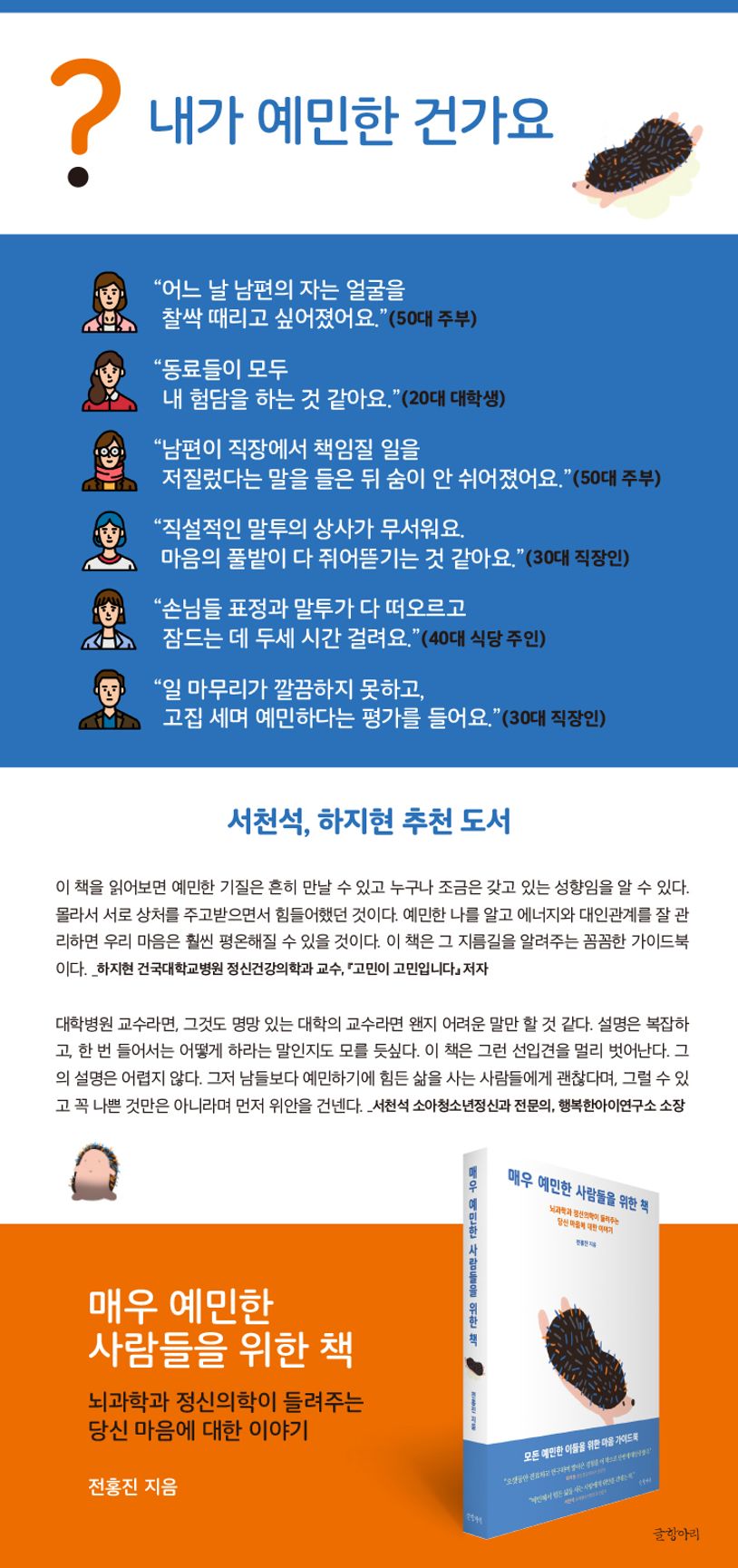 저자는이책에나오는사람마다상황에맞게증상을설명하고그와관련한연구에서객관적으로진단할만한기준들을들며조언하는데,그중에는매우예민한사람들이공통으로해당되는조언도있다.