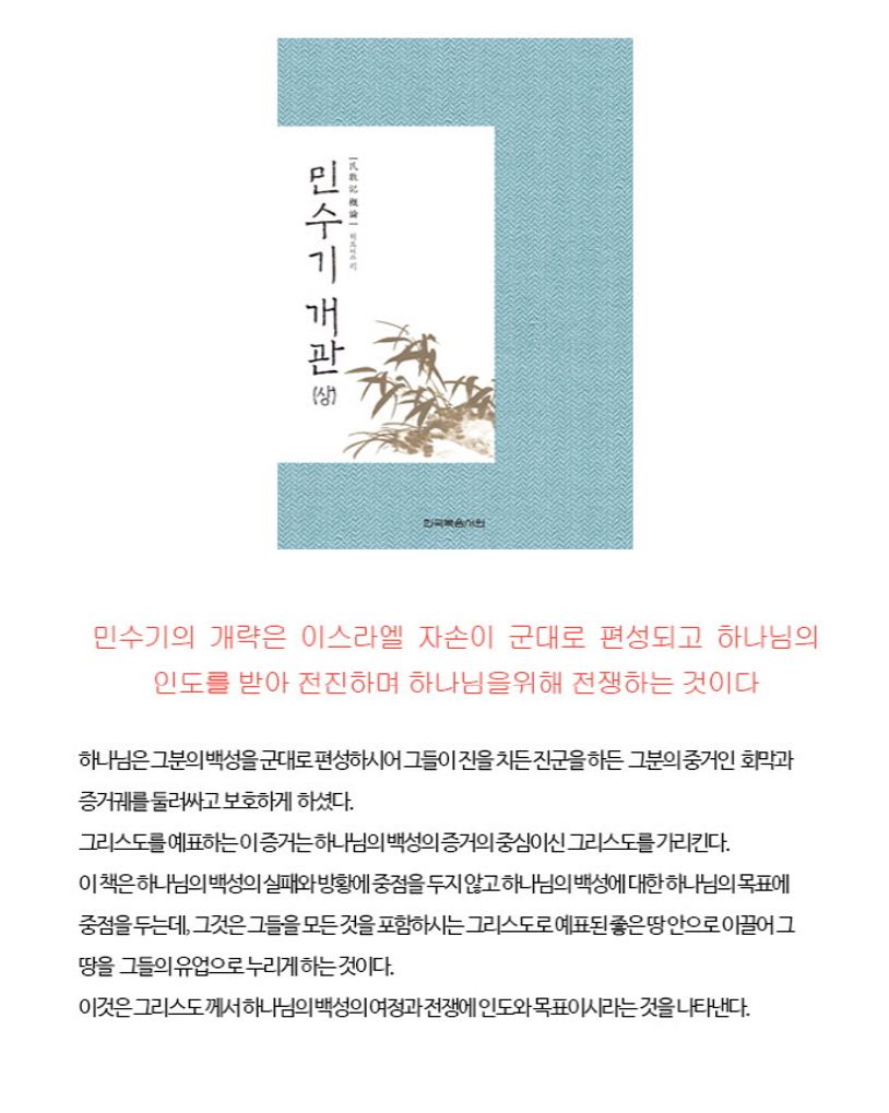 『민수기 개관(상)』 은 〈민수기의 개략과 중심과 핵심 단어와 단락 구분〉, 〈편성의 요지(1) - 수를 셈, 대형을 이루어 진을 침〉, 〈전쟁의 요지(1) - 왕들과 싸워서 이김〉, 〈전쟁의 요지(2) - 백성의 수를 다시 셈〉, 〈민수기에 있는 예표들(1) - 군대로 편성되고 진을 침〉 등을 수록하고 있는 책이다.