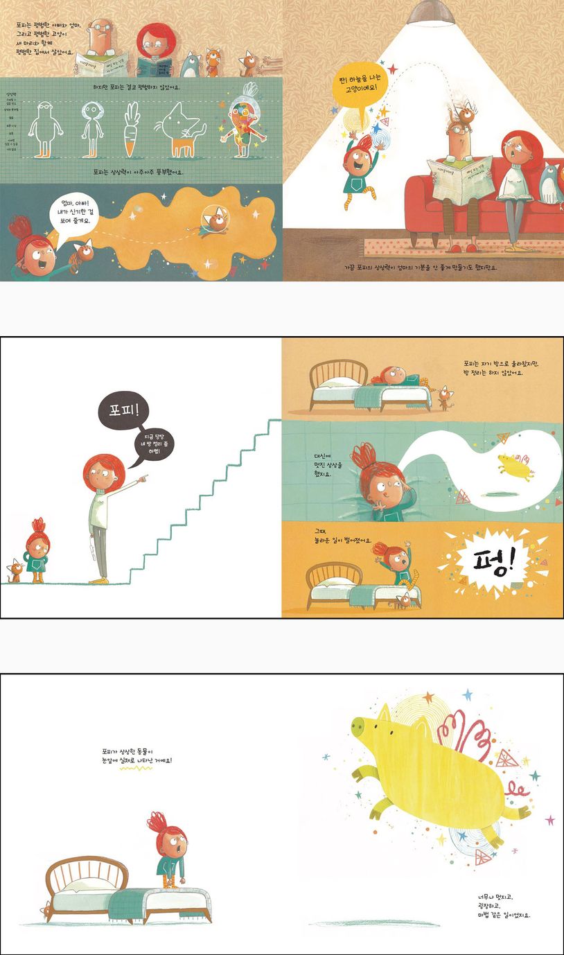 포피는 상상력이 아주아주 풍부한 아이예요. 어느 날, 포피는 평소처럼 침대에 누워 멋진 상상을 하고 있었어요. 그때, 놀라운 일이 벌어졌어요! ‘펑’ 소리와 함께, 포피가 상상한 동물이 눈앞에 실제로 나타난 거예요. 너무나 멋지고 신기한 일이었지요. 포피는 신이 나서 온갖 것들을 마구 상상했어요. ‘요정, 외계인의 유에프오, 자전거 타는 지렁이, 거대 핫도그, 털북숭이 매머드 등등’ 포피의 방은 금세 이상하고 신비한 것들로 가득 찼어요. 빈 곳이 없을 만큼 빼곡히요. 그런데 곧, 포피의 상상 속 동물이 문제를 일으키고 말았어요. 포피의 방은 순식간에 엉망진창이 됐지요. 포피의 방에서 시끄러운 소리가 들리자, 엄마와 아빠가 포피를 불렀어요. 포피는 깜짝 놀라서 모든 것을 없애려고 했어요. 하지만 상상을 멈추기가 쉽지 않았지요. 포피는 엄마와 아빠가 오기 전까지 모든 것을 원래대로 되돌릴 수 있을까요? 상상 속 친구들을 숨길 수 있는 좋은 방법이 없을까요?