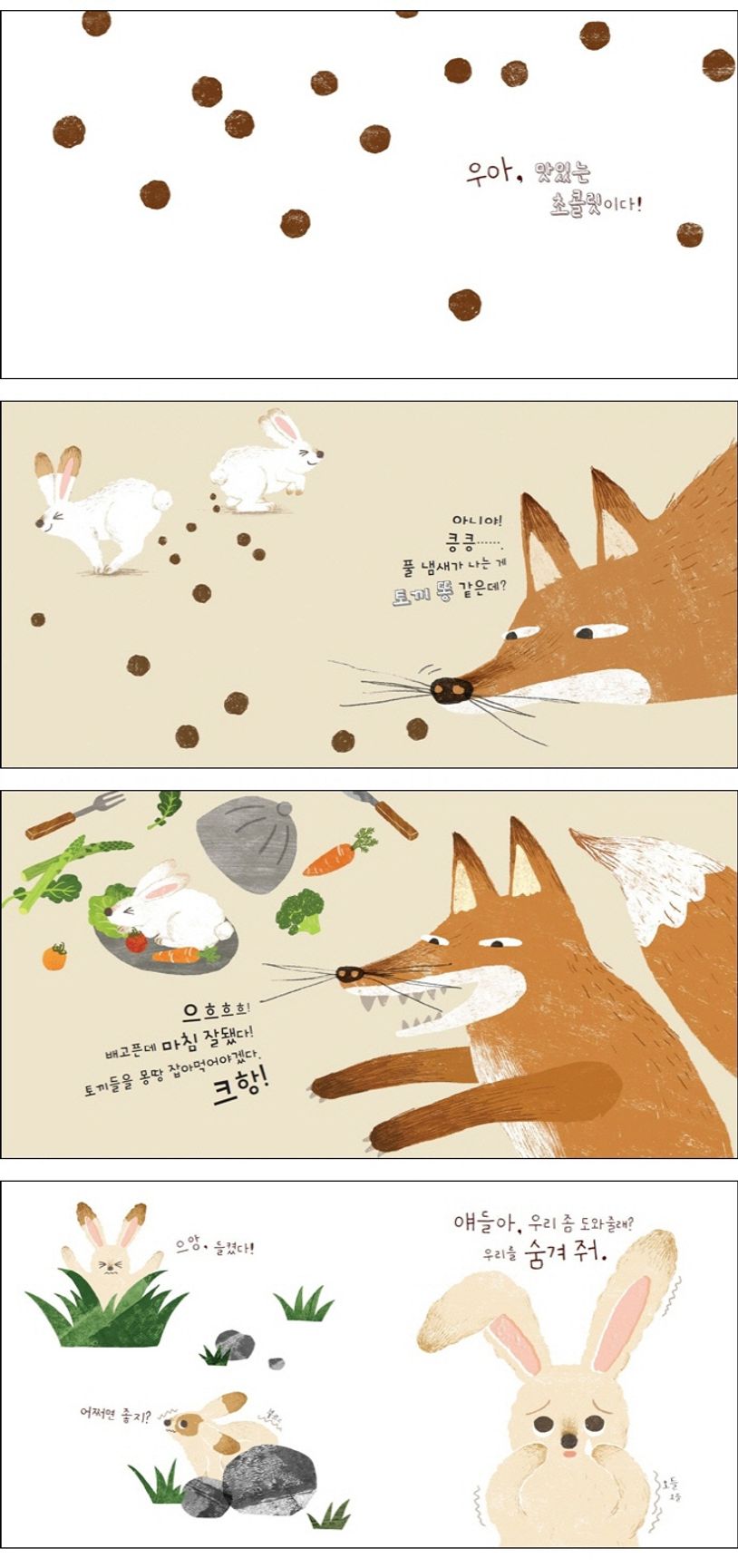 “토끼일까? 아닐까?” 까맣고 동글동글한 초콜릿을 보고 여우는 토끼 똥 같다고 하고, 작고 복슬복슬한 솜사탕을 보고는 토끼 꼬리 같다고 합니다. 과연 여우의 말이 맞는 걸까요? 배고픈 여우가 토끼들을 찾게 된다면 몽땅 잡아먹고 말 텐데 큰일입니다! [토끼일까?]는 유아들에게 친숙한 동물인 토끼를 소재로 한 흥미롭고 짜임새 있는 이야기와 귀엽고 세련된 그림이 돋보이는 그림책입니다. 책을 읽으며 유아들은 토끼의 생김새와 특징을 새롭게 인지하고, 대상을 비교하는 방식, 또 단서를 통해 결론을 유추하고 추리하는 과정을 자연스럽게 배울 수 있습니다. 이 책은 독자가 직접 이야기에 관여하도록 유도하는 특별한 장치를 설정하여 유아들이 이야기에 보다 몰입하며 큰 재미를 느낄 수 있게 합니다.