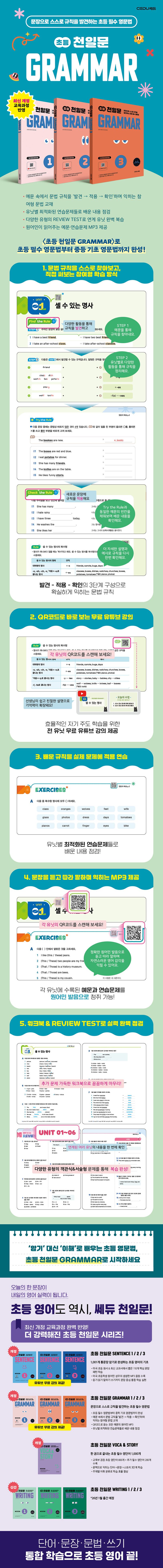 〈초등 천일문 GRAMMAR〉는 많은 사랑을 받은 〈초등코치 천일문 GRAMMAR〉의 개정판으로, 약 50%에 달하는 대대적인 개정을 통해 학습 흐름과 예문, 구성 전반이 한층 새로워졌다. 〈초등 천일문 GRAMMAR〉는 문법 규칙을 ‘발견 → 적용 → 확인’의 3단계로 익히는 참여형 문법서로, 문장을 읽고 규칙을 스스로 찾아내는 과정을 통해 문법 개념을 자연스럽게 체득할 수 있다.