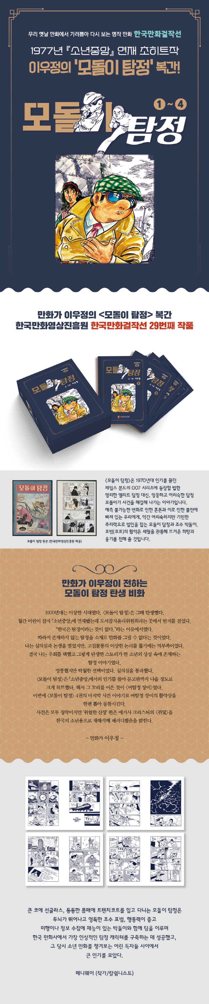 1979년 4월 문고판 발간을 마지막으로 독자 곁을 떠난 〈모돌이 탐정〉(이우정 저)이 42년 만에 다시 돌아왔다. 만화가 이우정의 〈모돌이 탐정〉이 한국만화영상진흥원은 ‘한국만화걸작선’ 29번째 작품으로 복간된 것이다. 〈모돌이 탐정〉은 1970년대 인기를 끌던 제임스 본드의 007 시리즈에 등장할 법한 영리한 엘리트 탐정 대신, 엉뚱하고 어리숙한 탐정 모돌이가 사건을 해결해 나가는 이야기다. 1977년 4월부터 《소년 중앙》 부록에 연재를 시작한 〈모돌이 탐정〉은, 독자의 폭발적인 사랑을 받아 문고판으로 제작되기도 했다. 또한 1978년 5월 연재를 마친 뒤에는 후속작으로 〈여탐정 장미〉를 탄생시키기도 했다.