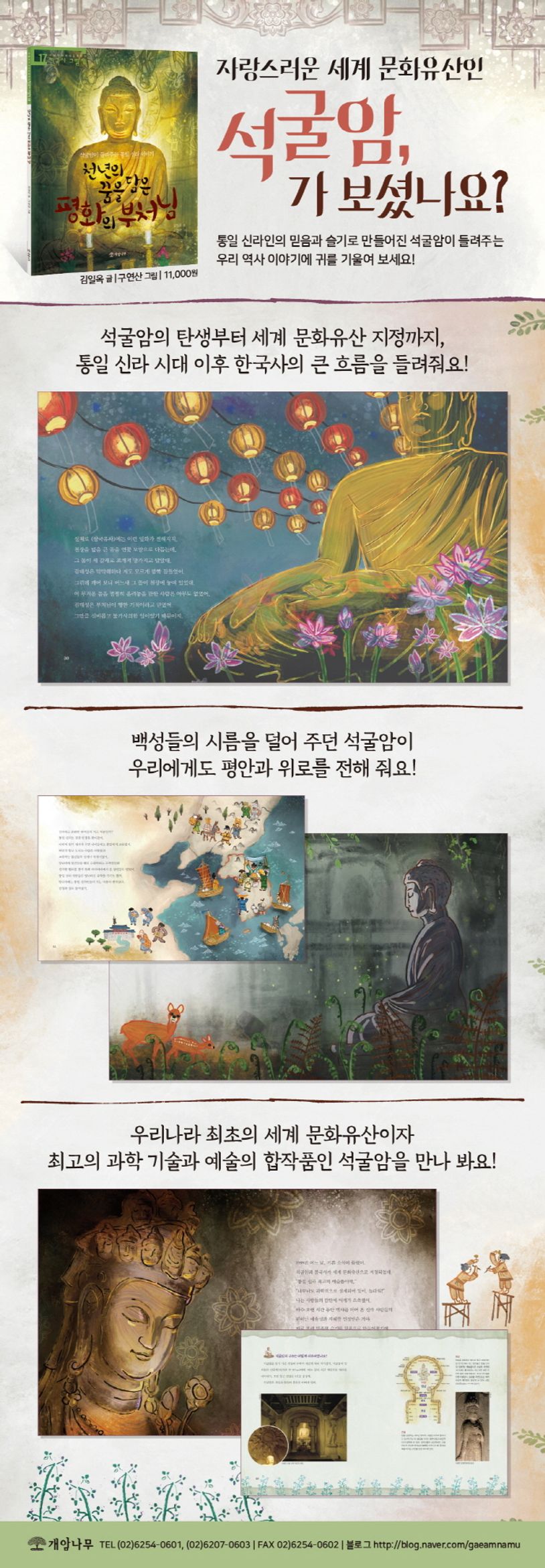 《천년의 꿈을 담은 평화의 부처님》은 끊이지 않던 전쟁과 고난 속에서 신라 사람들이 어떻게 통일을 이루고 석굴암을 만들게 되었는지, 그리고 우리 역사가 어떻게 바뀌어 왔는지를 석굴암 십일면관음보살상의 시점에서 들려줍니다. 글과 그림에는 석굴암에 깃든 인자하고 따뜻한 분위기가 녹아들어 있지요. 이 책의 그림 작가인 구연산 작가는 근엄한 석굴암 본존불의 모습을 부드러우면서도 섬세한 색채로 표현해, 독자로 하여금 석굴암을 직접 볼 때 느낄 수 있는 고적하고 평안한 분위기를 경험하게 해 줍니다.