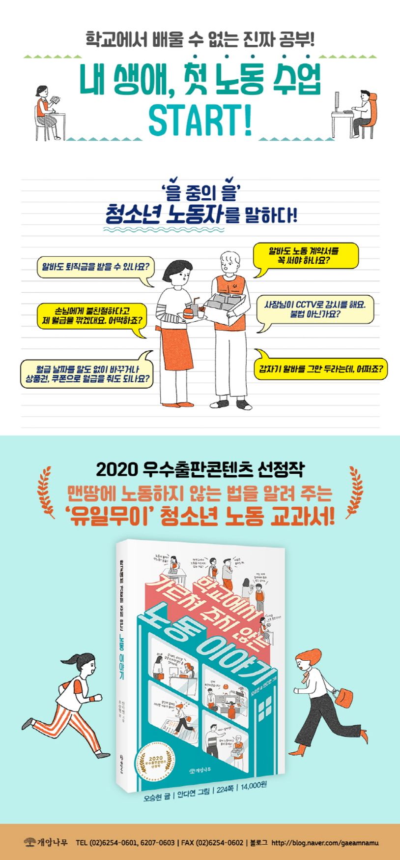 “어른들은 학생들이 노동 문제에 관심을 가질 필요가 없다고 생각합니다. 학생이 할 일은 공부뿐이고 그들의 자리는 오직 학교라고 생각하죠. 현실은 다릅니다. 노동 현장에서 일하는 학생들이 적지 않은데, 언제까지 애들은 몰라도 돼”만을 반복할 건가요? 사람이 살아가는 데 꼭 필요한 내용을 가르치는 것이 교육이라고 한다면 학교는 진짜 공부를 어물쩍 넘기고 있는 건 아닐까요?”