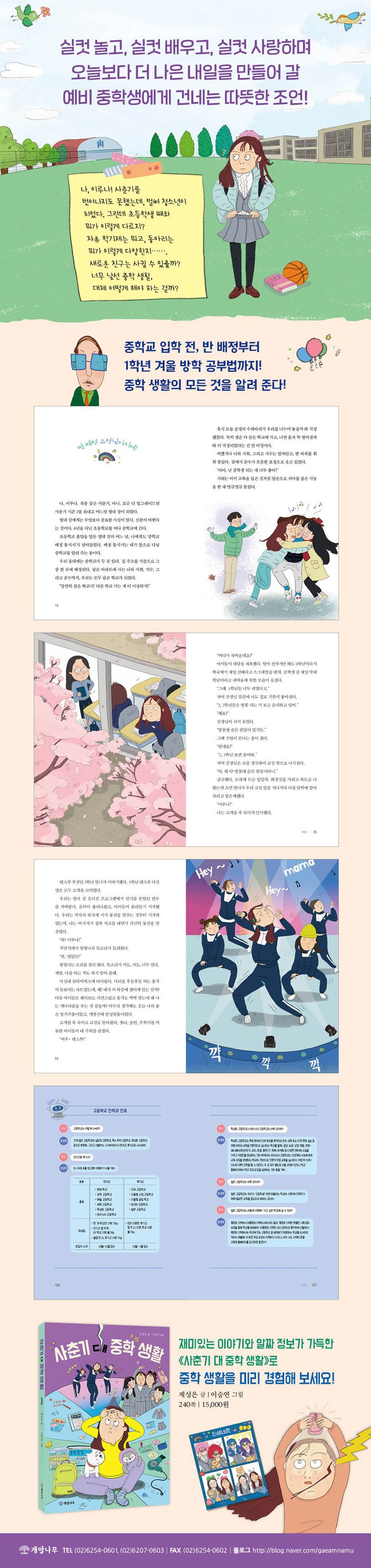 ≪사춘기 대 중학 생활≫은 〈사춘기 대 갱년기〉 시리즈의 주인공 루나가 초등학교를 졸업하고 중학교에 입학하여 보낸 1년을 짧은 동화 형식으로 엮은 책입니다. 자유 학기(학년)제가 무엇인지, 지필 고사, 수행 평가는 어떤 방식으로 이루어지는지, 교내 대회에는 어떤 것들이 있는지 등 학업에 관련한 문제는 물론이고, 반 배정, 동아리 활동, 축제 등 학교생활에 관련한 내용과 연애 문제, 친구 문제 등 아이들이 진짜 궁금해할 중학교 생활에 대한 전반적인 내용을 모두 담았습니다. 짧은 이야기 하나하나가 각각의 주제를 다루고, 완결성이 있어 필요한 부분을 따로 찾아보기에도 좋습니다. 또 부록을 통해 중학 생활과 관련한 알짜 정보를 자세히 전달합니다.