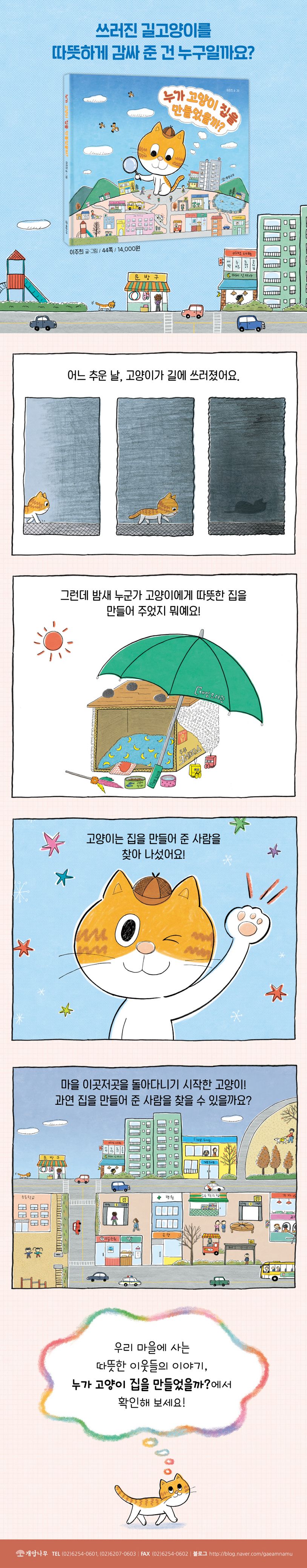 ≪누가 고양이 집을 만들었을까?≫는 추위에 떨다 길가에 쓰러진 고양이가 자신에게 집을 만들어 준 사람을 찾아가는 과정을 그린 그림책입니다. 고양이가 마을의 이곳저곳을 두루 살펴보는 과정을 통해 우리 주변에 어떤 이웃이 살고 있는지 알아보고, 더불어 살아가는 공동체의 중요성을 전합니다.