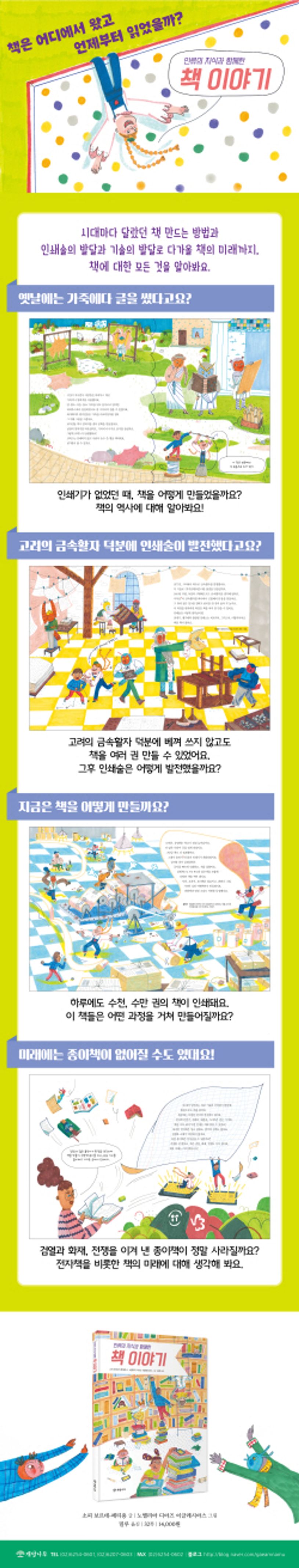 ≪인류의 지식과 함께한 책 이야기≫는 문자의 역사와 함께 발전한 세계의 다양한 책 이야기를 다채로운 그림과 함께 전달합니다. 더불어 과거, 종이가 생기기 전과 종이책을 넘어 전자책이 생긴 현재를 짚어 나가면서 책의 미래를 함께 생각해 봅니다.