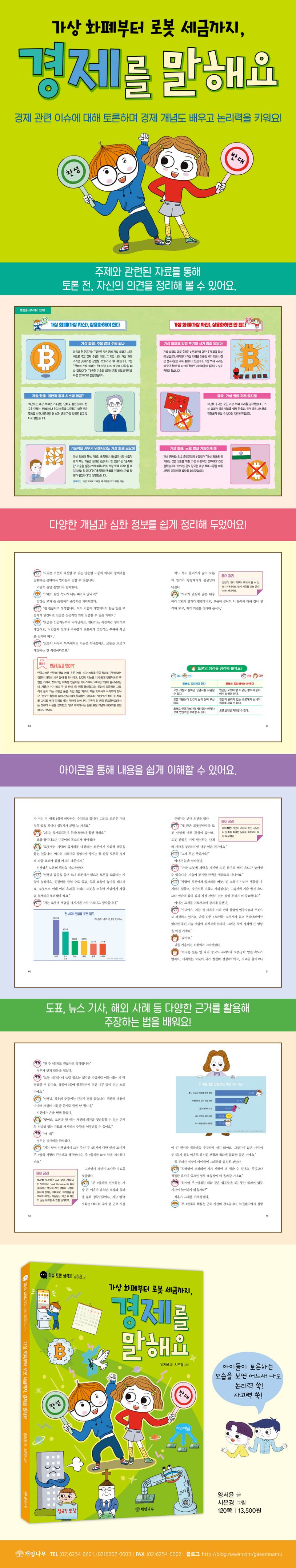 ≪가상 화폐부터 로봇 세금까지, 경제를 말해요≫는 최근 이슈로 떠오르는 다양한 경제 관련 주제에 대해 찬반 토론을 담은 지식 정보책입니다. 어려운 경제 개념을 익힐 수 있고, 찬반 토론을 하는 과정을 통해 자신의 생각을 알맞은 근거를 들어 주장하는 능력인 논리력을 기를 수 있습니다.