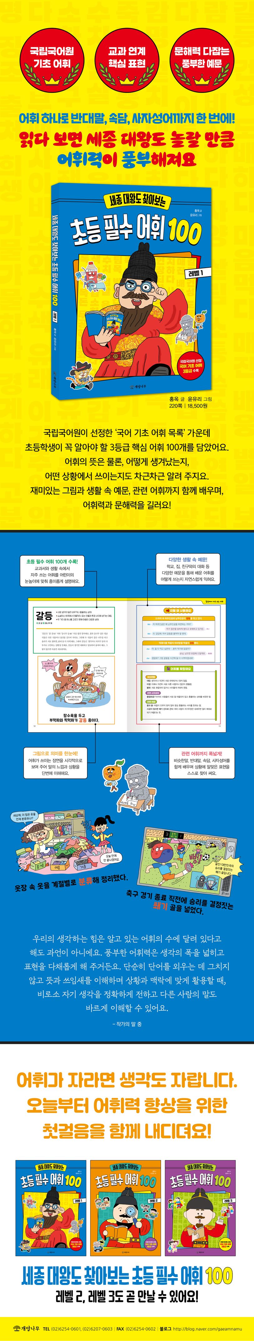 《세종 대왕도 찾아보는 초등 필수 어휘 100 레벨 1》은 국립국어원에서 지정한 ‘국어 기초 어휘 선정 목록’ 가운데 초등학생이 반드시 알아야 할 3등급 어휘 중 핵심 어휘 100개를 알기 쉽게 담은 어휘 학습서입니다. 어휘의 뜻만 알려 주는 데서 그치지 않고 그 말이 어떻게 생겨났는지, 어떤 상황에서 쓰이는지 차근차근 설명합니다. 재미있는 그림과 생활 속 예문, 함께 알면 좋은 관련 어휘까지 곁들여 어휘력과 문해력을 기초부터 탄탄하게 기를 수 있습니다.