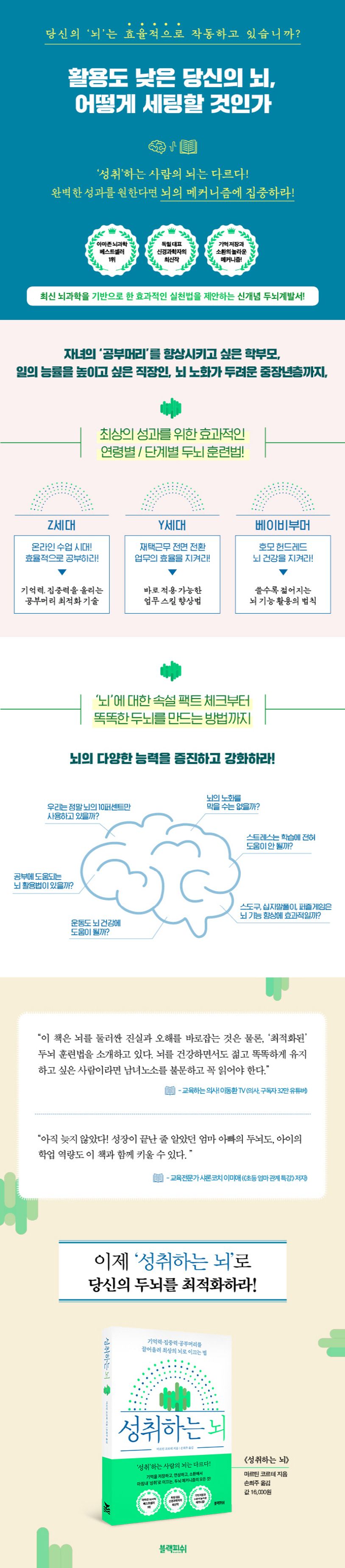 독일의 대표적인 신경과학자 마르틴 코르테 박사는 최신 뇌과학과 신경학을 기반으로 ‘최상의 성과를 내는 뇌’의 모든 비밀을 파헤쳐 이 책 《성취하는 뇌》에 담았다. 스도쿠처럼 특정 영역에만 적용되거나 일회성에 그치는 단순한 뇌 단련법 대신 장기적이고 지속적으로 뇌의 인지기능을 향상시키는 훈련법을 소개하고 있는 이 책에는, Z세대를 위한 공부머리 최적화 기술부터 Y세대를 위한 업무 스킬 향상법, 베이비부머를 위한 젊은 뇌 단련법 등 모든 세대에게 적용 가능한 두뇌 훈련법이 방대한 과학 연구를 토대로 정리되어 있다.