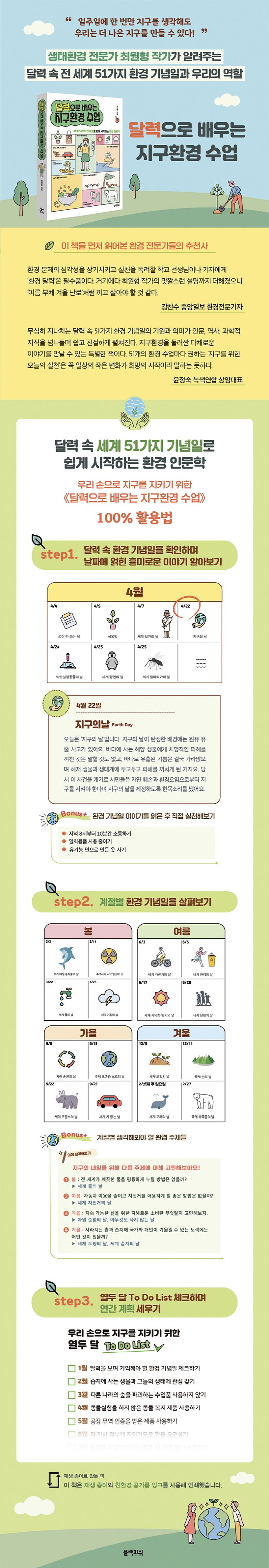 현재 지구가 겪는 극심한 폭염과 한파도, 미세 먼지도, 코로나19 같은 세계적 전염병도, 노동력 착취나 성 착취, 빈곤, 난민 등의 주제도 모두 환경을 빼놓고는 다룰 수 없다. 이에 책에서는 ‘인간의 더 나은 삶을 위해 동물의 생명을 마음대로 빼앗아도 될까?’, ‘전 세계가 깨끗한 물을 평등하게 누릴 방법은 없을까?’ 등 환경과 관련된 뜨거운 화두를 던지며 토의의 장을 마련하고자 했다. 또한 기념일에 맞는 환경보호 방법 100여 가지를 수록, 지구를 위한 실천을 누구든 쉽게 시작할 수 있도록 했다. 더 나은 지구를 위해 작은 일이라도 시도해보고 싶을 때, 이 책을 펼치는 일은 그 시작이 되어줄 것이다.