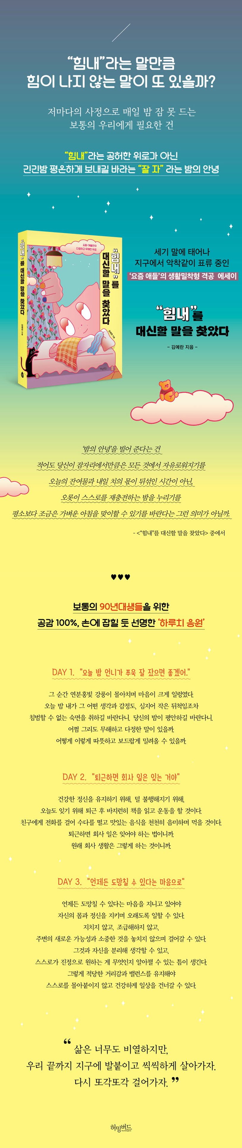 이 책에는 험난하고 지난한 시대에 처한 90년대생의 현실이 가감 없이 담겨 있다. 이생망, 혐생, 헬조선, N포 세대, 픽미 세대, 공시족, 욜로, 2030 투자 개미 등의 단어가 공존하는 시대에서 그저 평범히 살기 위해 발버둥치는 한 인간의 눈물겨운 분투기이자 생존기와도 같다. 눈물 나게 짠하기도, 코끝이 시큰거리게 애틋하기도, 애처롭고 웃프기도 하지만, 그럴수록 씩씩하게 나아가게 하는 최선의 노력과 용기를 이야기한다.
