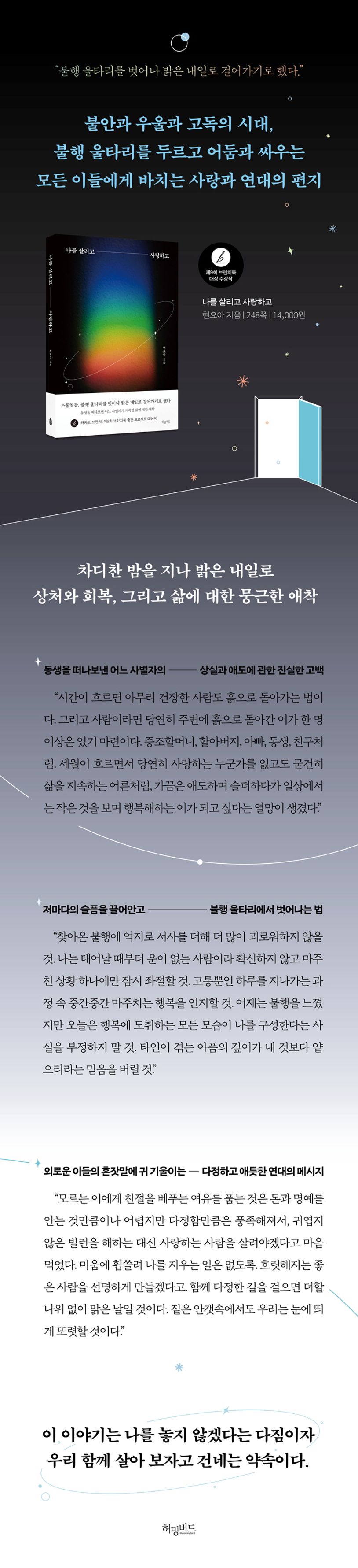 상실의 고통을 겪으며 절망하고 무력해졌으나, 애도의 시간을 통과하며 숨겨진 생의 욕구를 알아차린 저자는 저마다의 아픔을 끌어안고 살아가는 사람들에게로 시선을 뻗는다. 외로운 이들의 혼잣말에 귀 기울이고 손 내밀겠다는 작은 선의를 통해 닿음이 귀해진 사회에서 연결이 가져다주는 치유의 힘을, 불행 울타리를 벗어나면서 발견한 삶에 대한 애착과 희망을 전한다. 삶의 의미를 찾지 못해 공허와 허무에 시달리는, 불안과 우울의 시대에서 스스로를 옥죄며 고립되어 가는 사람들에게 좌절을 뚫고 전진할 용기를 주는 사랑과 연대의 편지와도 같다. 아픔을 회피하지 않고 면밀히 해석하는 행위를 통해 자신을 괴롭히던 불행 울타리를 비로소 깨고 나온 저자가 하고 싶은 이야기는 하나로 귀결된다.
