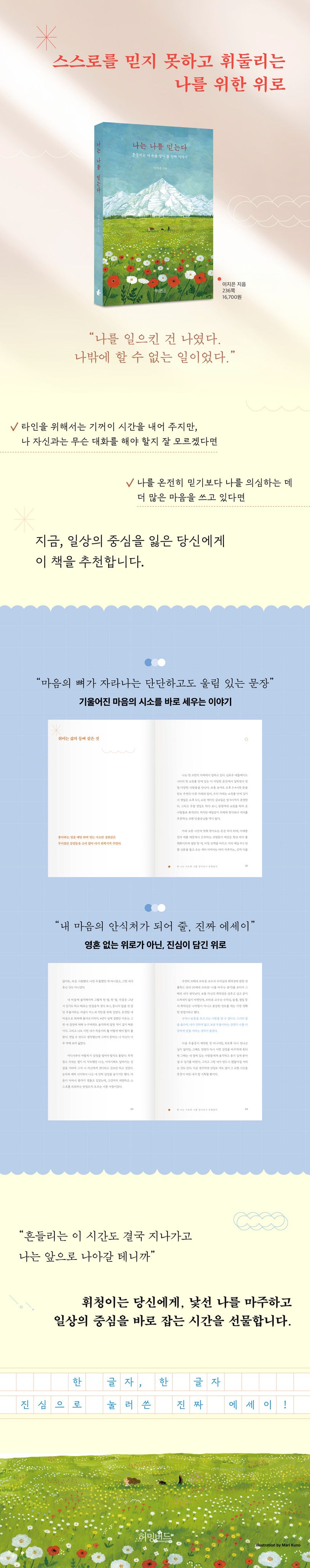 이 책은 나를 온전히 믿기보다, 나를 의심하는 데 더 많은 마음을 쓰는 우리 모두를 위한 이야기이다. 서른이 넘어서도 스스로를 잘 알지 못했다는 저자는 30대에 낯선 땅으로 이민을 떠나 비로소 진정한 나를 마주하게 된다. 저자가 직접 부딪히고 경험한 두 번째 성장기에 관한 진솔한 이야기로, 마음의 뼈가 자라나는 단단하고도 울림 있는 문장이 곳곳에 담겨 있다. 일과 삶의 밸런스를 맞추는 것, 내가 살고 있는 곳에서 주인이 되는 것, 매일매일 나를 위한 시간을 갖는 것. 소란한 세상에서도 나를 잃지 않고, 중심을 잡기 위한 저자의 따듯한 격려와 위로를 통해 우리 역시 낯선 나를 마주하고, 흔들리는 삶의 중심을 새롭게 잡을 수 있을 것이다. 지금, 내 일상이 조금 흔들리고 있다면 이 책을 통해 나를 돌아보는 시간을 스스로에게 선물해 보자. 《나는 나를 믿는다》라는 바로 이 책의 제목처럼, 나를 믿고 더 반짝이는 내일로 나아갈 수 있을 것이다.