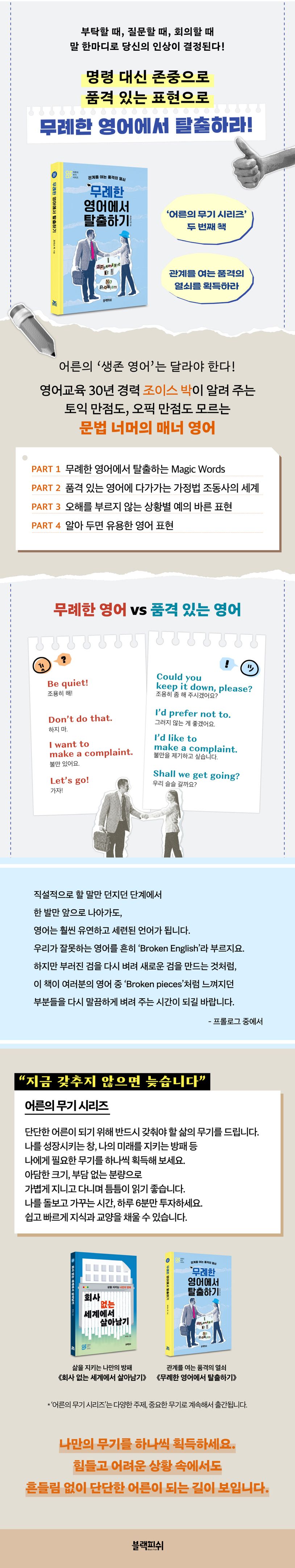 《무례한 영어에서 탈출하기》는 30년 넘게 다양한 현장에서 영어를 가르쳐 온 조이스 박 저자의 ‘문법 너머의 영어’ 이야기다. 바쁜 직장인들이 가볍게 들고 다니며 짧은 시간 안에 교양과 실용을 동시에 채울 수 있는 ‘어른의 무기 시리즈’ 두 번째 책으로, 짧은 분량, 간결한 설명, 실제 상황에서 바로 써먹을 수 있는 문장들로 구성되어 출퇴근길이나 점심시간에 부담 없이 읽을 수 있다. 상대방을 불편하게 만드는 영어 표현, 한국식 직역에서 비롯된 무례한 문장, 예의 바르고 자연스러운 대체 표현들을 풍부한 예시와 함께 알차게 소개한다. 이 책을 통해 영어 실력을 향상하는 것을 넘어서 언어 속에 포함된 태도와 문화 차이를 이해하는 성숙한 어른으로 거듭날 수 있을 것이다. 무례한 영어에서 벗어나 정중한 어른의 언어를 익히는 것, 그것이 오늘날 우리에게 필요한 또 하나의 ‘어른의 무기’다.