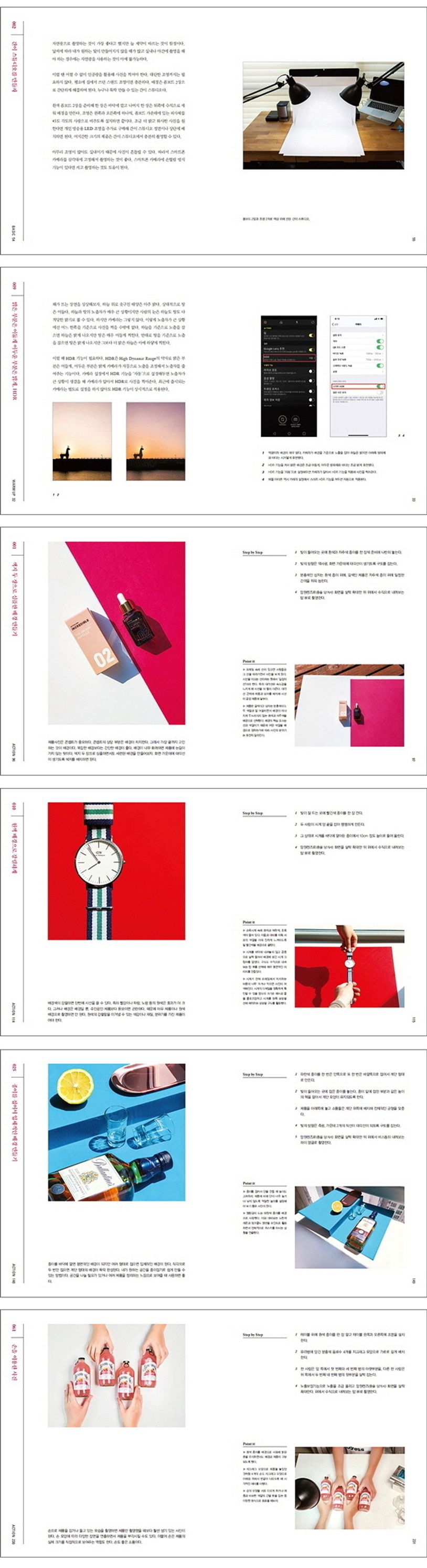 책에서는 스마트폰 카메라의 기본적인 기능과 사용법에 대해 설명하는 〈준비운동〉, 빛과 배경, 보정 등 기본적인 촬영법을 알려주는 〈기본촬영〉, 그리고 〈실전촬영〉에서는 본격적을 제품사진을 찍는 아이디어 100가지를 소개한다. 〈실전촬영〉에서 소개하는 노하우는 평면배경을 활용하고, 입체배경으로 근사하게, 빛과 그림자를 이용한 촬영법, 독특한 배경을 활용하는 법, 다양한 소품을 이용한 촬영법 등 주제별로 모아 제품에서 끌어낼 수 있는 감성과 분위기 가치 등을 표현하는 법을 효과적으로 알려주고 있다.