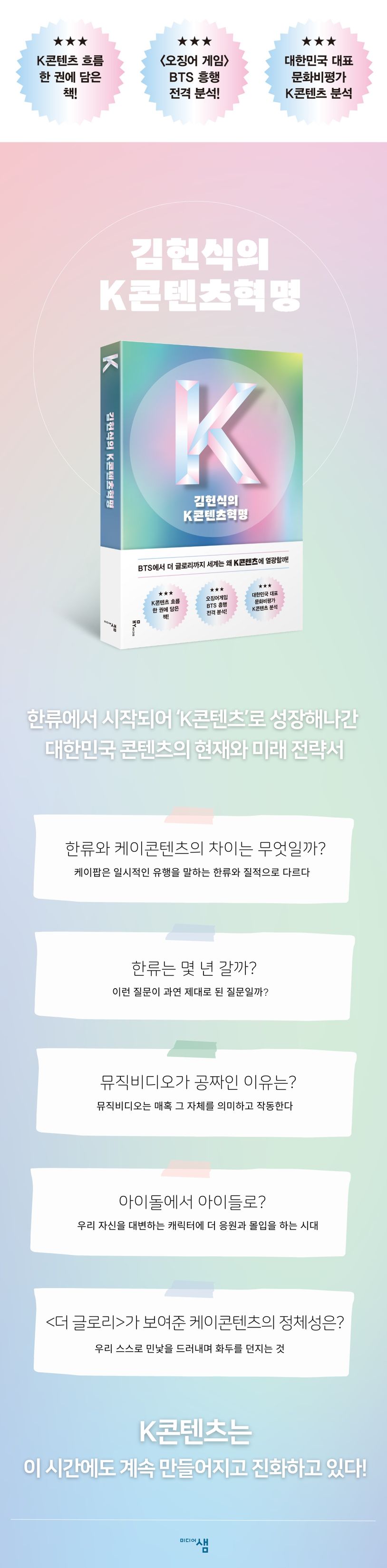 일시적인 유행일 거라는 편견에 싸여 있던 한류에서 훌쩍 나아가, ‘K’라는 접두사만으로 누구나 즐기기 좋은 콘텐츠, 문화 콘텐츠 산업의 선두주자로서 인정받을 수 있게 된 이유는 무엇일까? 《김헌식의 K콘텐츠혁명》은 대한민국 대표 문화비평가 김헌식의 K콘텐츠 분석서로, 한류에서 시작해 K콘텐츠로 확고히 자리잡기까지 대한민국 콘텐츠 산업의 흐름을 제대로 톺아보는 국내 유일한 책이다. 또한 그 어느 때보다 치열한 환경에서도 K콘텐츠가 지속적으로 국제 시장에서 사랑받고 있는 이유가 무엇인지, 그 뒤에 어떤 성장 과정과 저력이 숨겨져 있는지를 섬세하고 명쾌하게 풀어내고 있다.