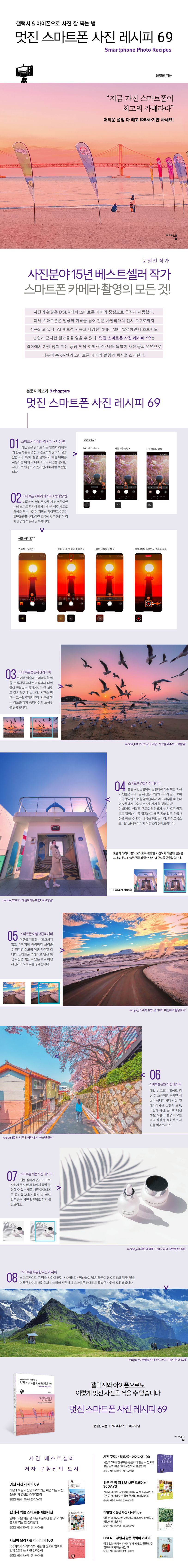 《멋진 스마트폰 사진 레시피 69》는 이런 시대적 변화에 발맞춘 책이다. 기존 사진의 기본 원리를 충실히 담되, 누구나 스마트폰만으로도 사진의 기본을 익히고, 곧바로 멋진 사진을 찍을 수 있도록 돕는다. 특히 책의 첫 챕터인 〈스마트폰 카메라 레시피〉에서는 갤럭시와 아이폰을 중심으로 사진과 영상촬영 기능으로 나누어 설명하고 있다. 또한 노출과 렌즈, 셔터스피드 등 스마트폰 카메라의 기본 기능을 쉽게 익힐 수 있도록 직관적인 튜토리얼식 설명으로 구성되어 있어 어렵지 않게 스마트폰 카메라의 다양한 기능을 따라할 수 있다.