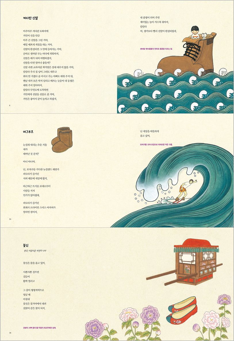 신발을 신고 세상을 품고 싶어 하는 화자의 이야기가 31편 들어 있는 이 시집은, 순우리말 시에 민화로 그 내용을 표현하여 어린이들에게 더욱 친근감을 준다.