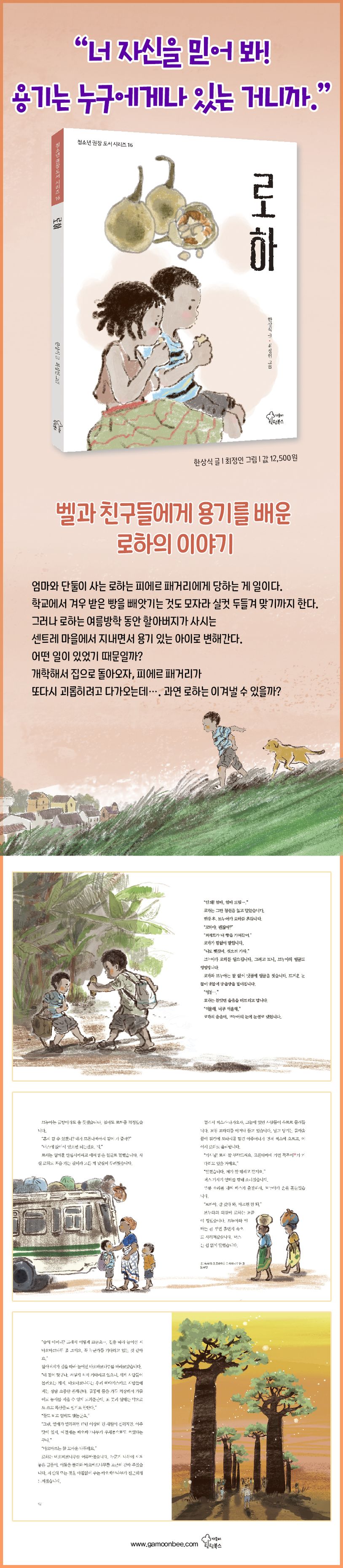 로하가 만난 할아버지는 마을의 자랑거리였고, 장애를 가지고 태어난 펠레나도 둘도 없이 좋은 친구가 되어 주었다. 그리고 자기를 살리려고 목숨을 아끼지 않은 떠돌이 개, 벨…. 바오바브나무가 없었다면 벨에 대한 마음의 짐을 덜어내지 못했을 터이니, 그도 소중한 존재이다.