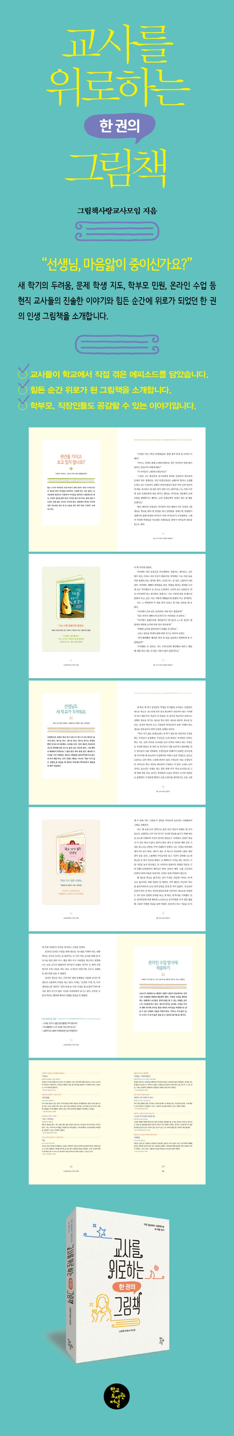 현직 교사들이 학교생활에서 겪은 에피소드와 함께 한 권의 그림책을 소개하는 책. 새 학기의 두려움, 문제 학생 지도, 학부모 민원, 온라인 수업 등 현직 교사들의 진솔한 이야기와 힘든 순간에 위로가 되었던 인생 그림책을 소개한다. 자녀와 소통이 어려운 부모나 업무와 인간관계로 힘들어 하는 직장인들도 공감할 만하다. 편견 없이 아이들을 대하고, 동료를 이해하고, 진정한 나를 바라보게 하는 그림책의 놀라운 힘을 느낄 수 있다.
